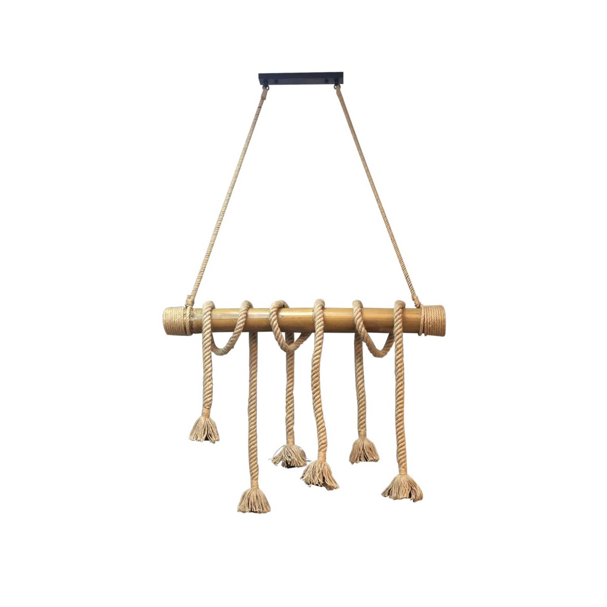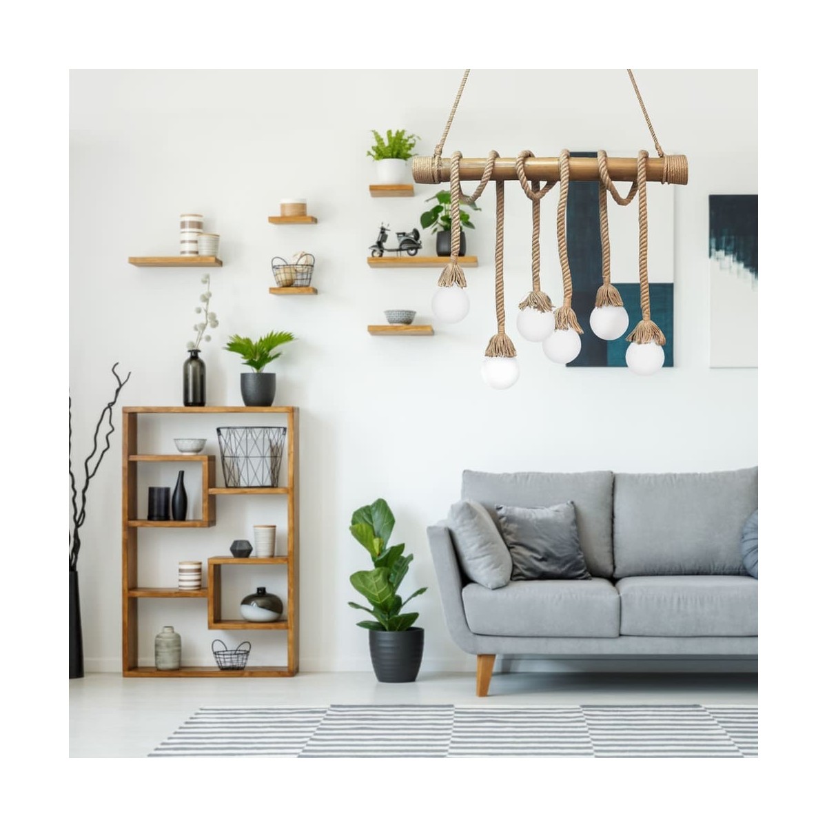 Lámpara de techo colgante fabricada con bambú y cuerda pita electrificada con 6 luces. Las bombillas E27 no están incluidas en el producto. Puede combinarse con bombillas LED de estilo vintage, aportando un estilo rústico a la decoración de la estancia. Al estar fabricada con elementos naturales la lámpara variará respecto a la foto del producto.