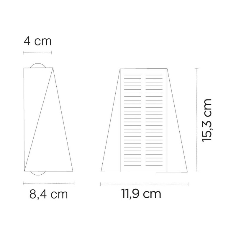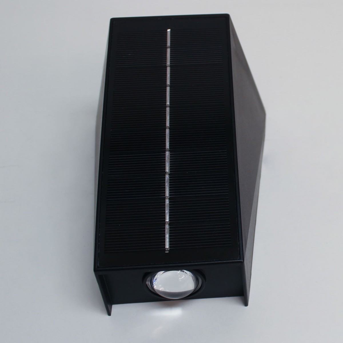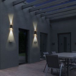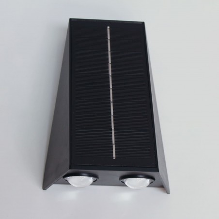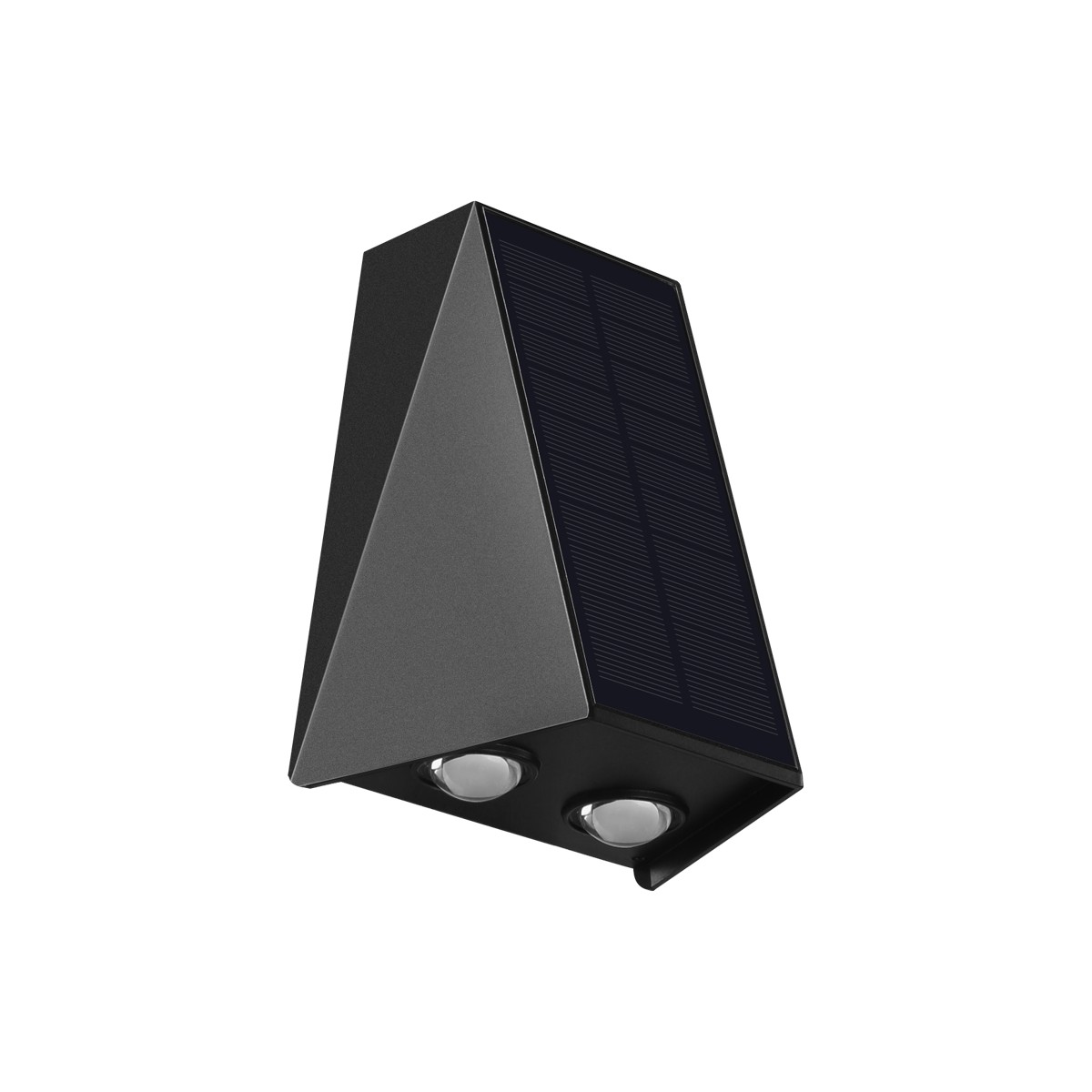 Aplique de pared solar LED Nalin para jardines y terrazas. Aplique diseñado para aportar una suave luz ambiental en paredes de exterior. Luz directa hacia abajo e indirecta hacia arriba iluminando la pared. Permite utilizarse sin consumo de luz al contar con un panel solar para cargar la batería durante el día. El aplique cuenta además con sensor crepuscular y memoria de encendido. Temperatura de color blanca neutra (4000K).