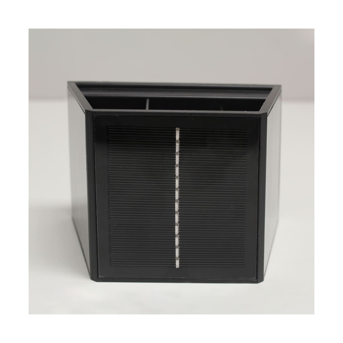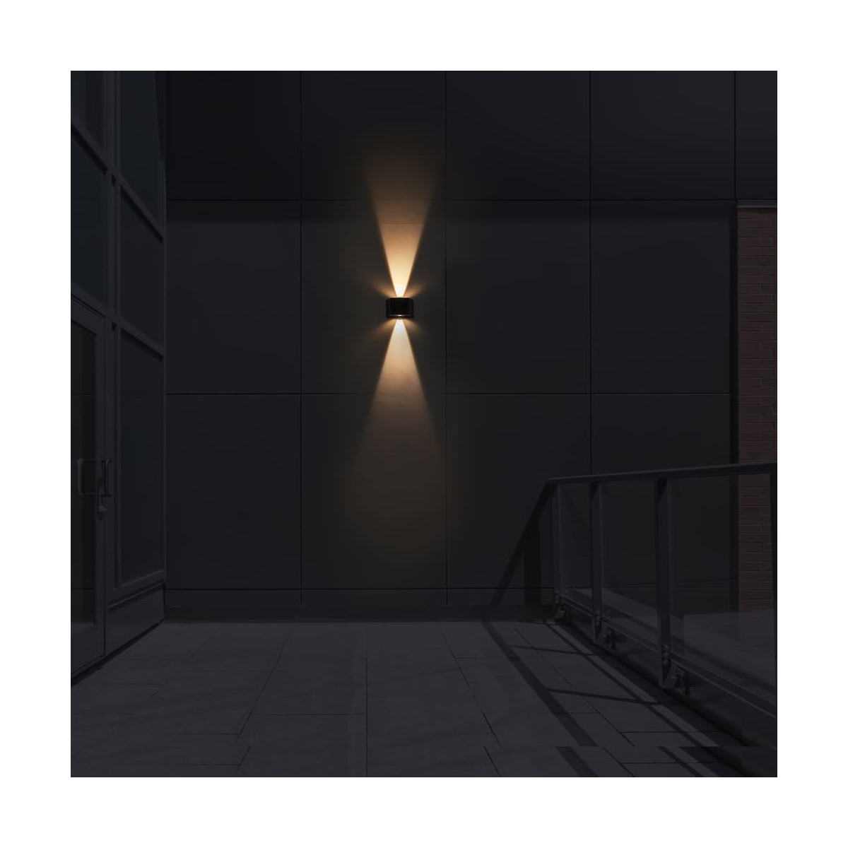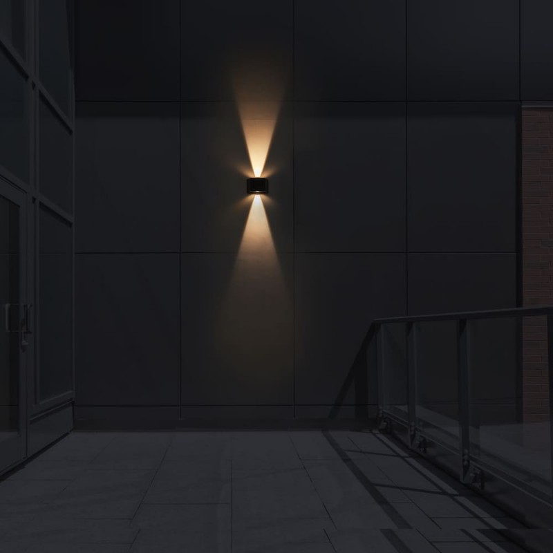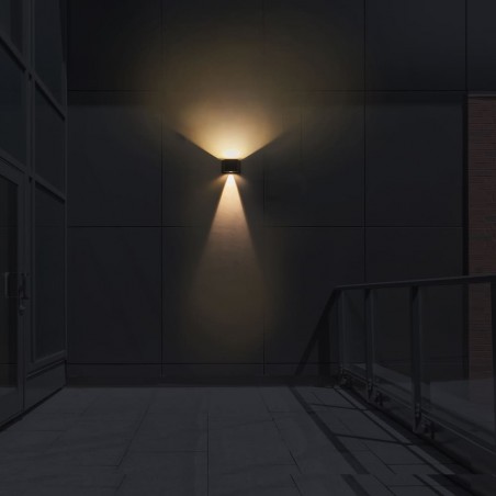 Aplique LED Vio con iluminación arriba y abajo. Aplique diseñado para aportar una suave luz ambiental en paredes de jardines, terrazas y porches. Su diseño permite ajustar la apertura de cada haz de luz de forma independiente. Cuenta con un panel solar en la parte frontal para cargar el aplique con la luz del sol y poder utilizarlo sin consumo de energía. Temperatura de color blanca cálida (4000K) y sensor crepuscular.