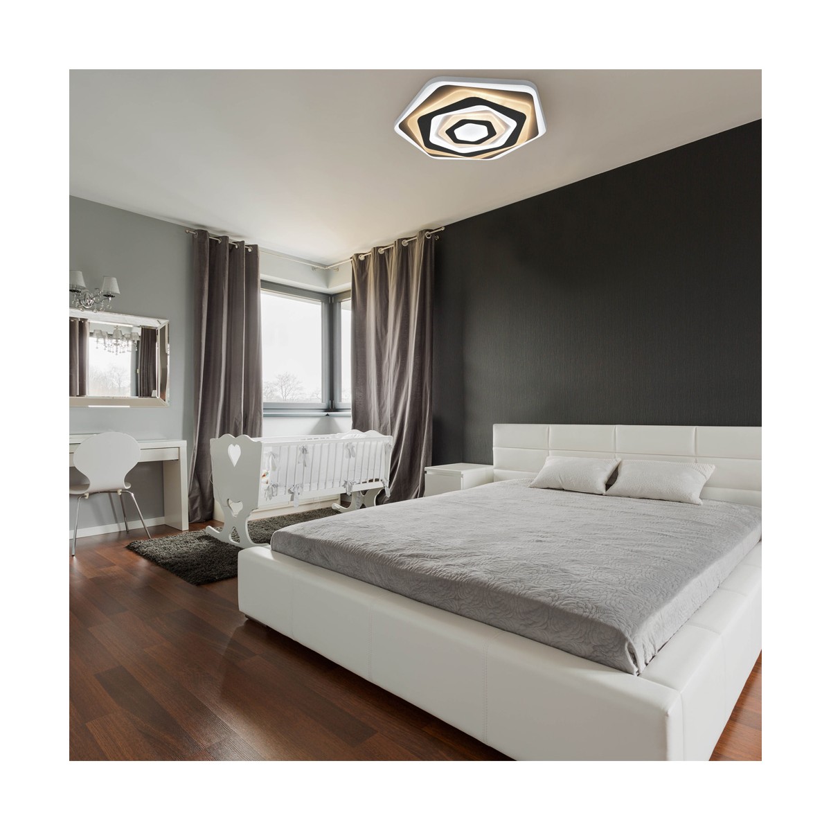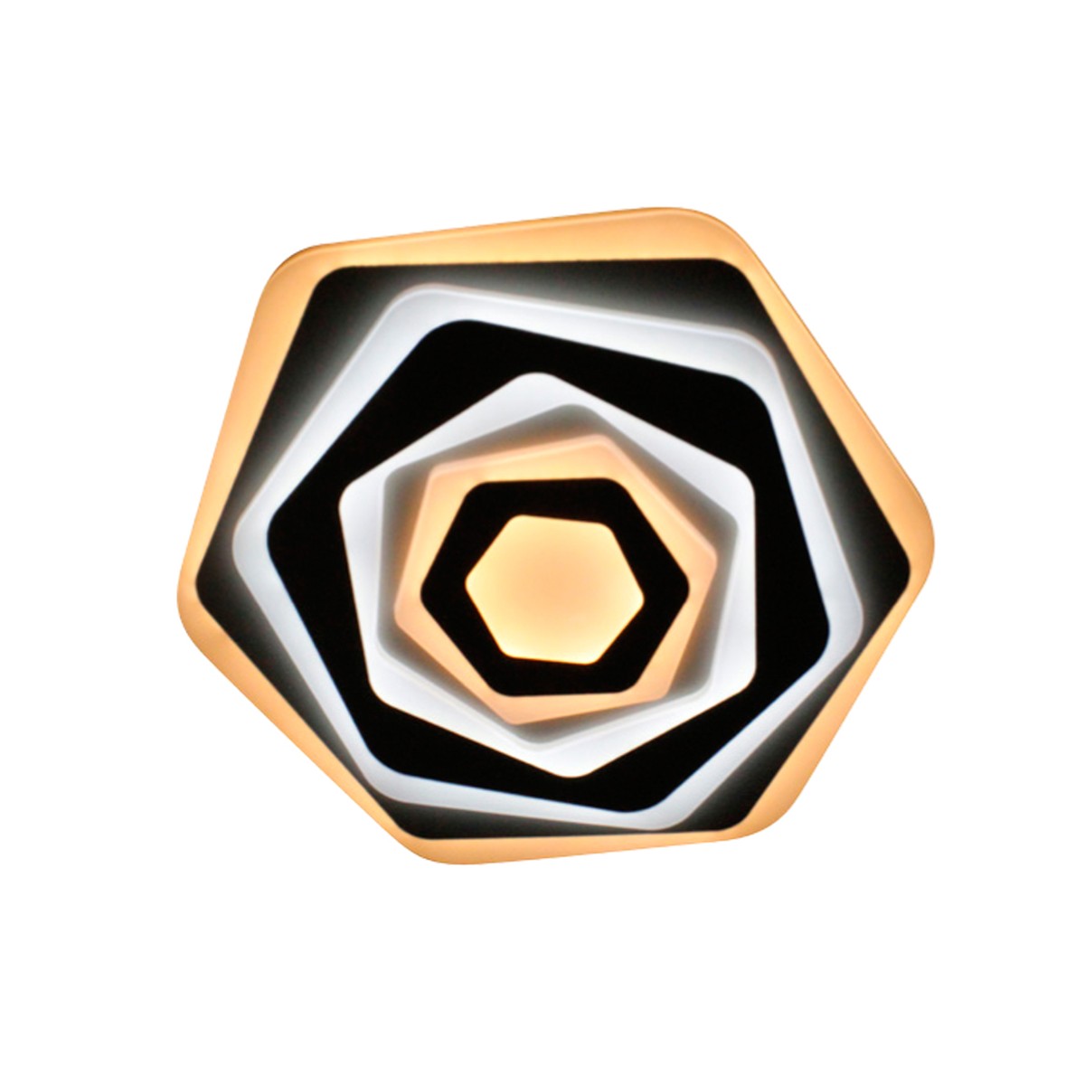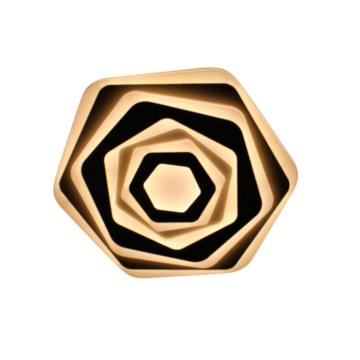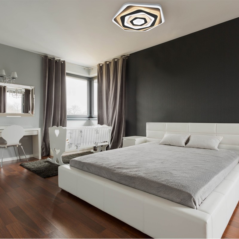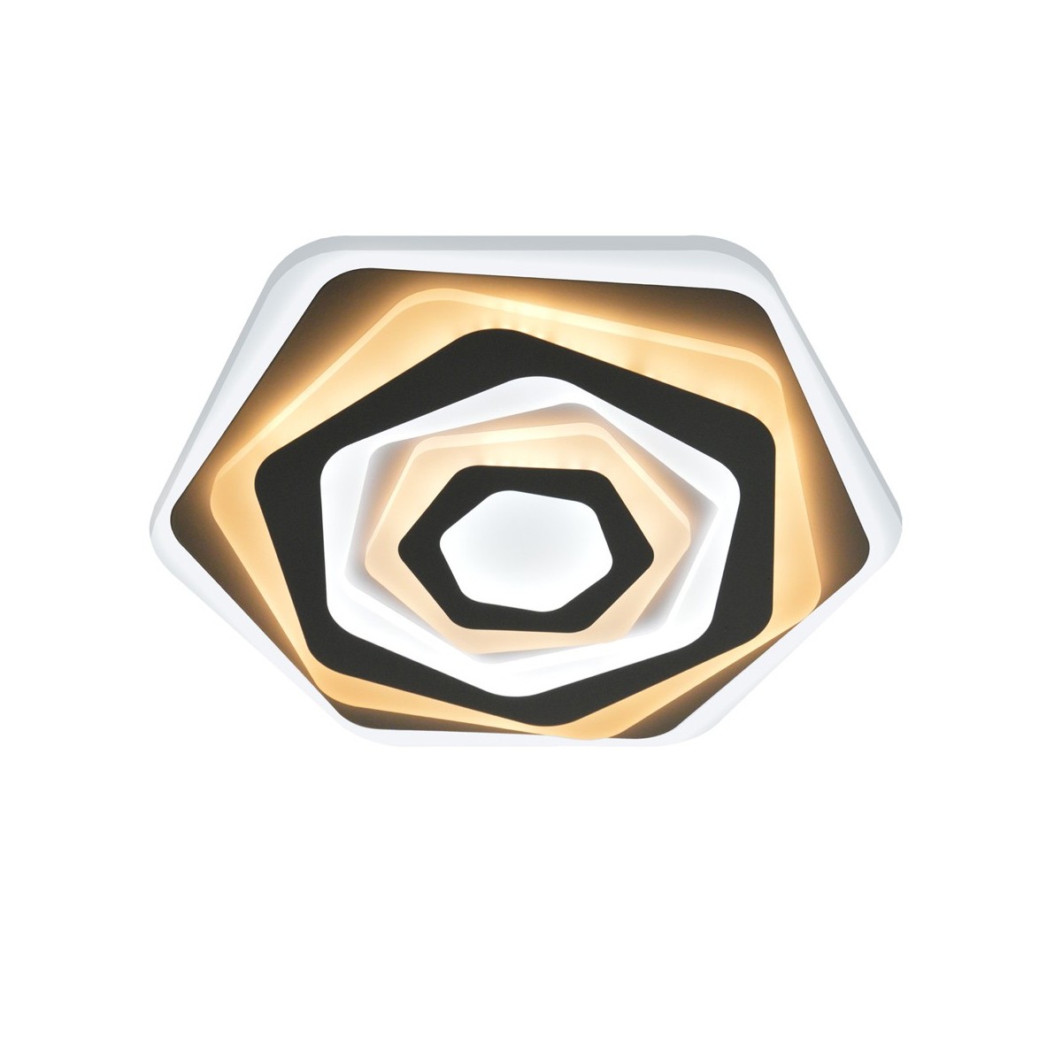 Plafón LED ROSSE con iluminacion LED de 60W, destaca por sus placas geométricas superpuestas a distintos niveles. Incluye mando a distancia. Puede encenderse con luz fría, luz cálida o luz neutra. Con función de memoria de encendido.
