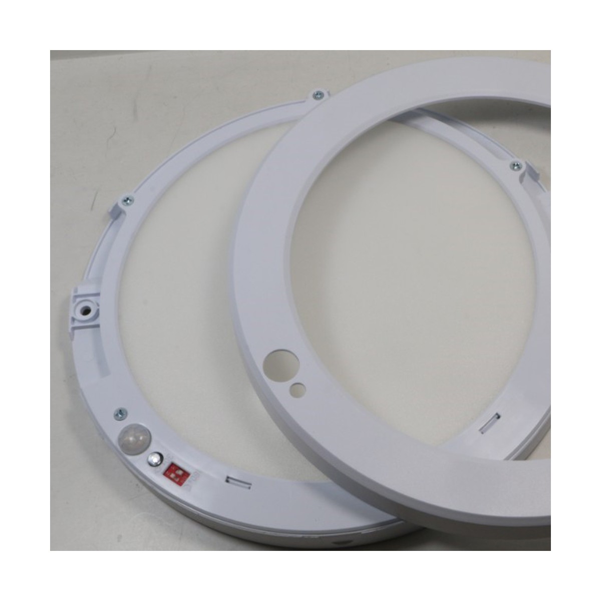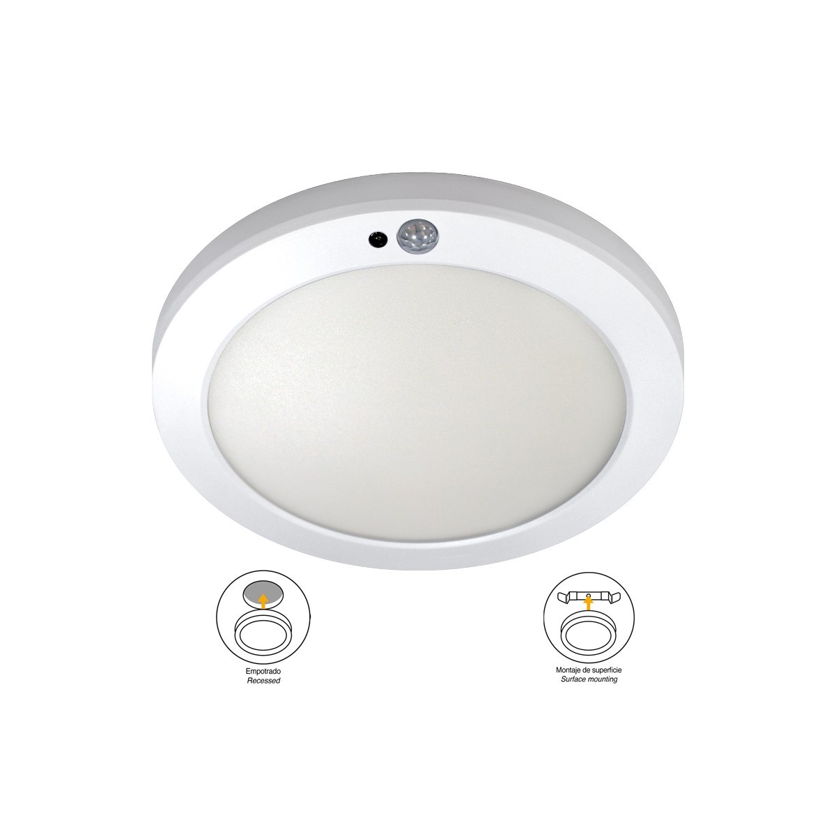Luminaria LED de 18W. Cuenta con selector de temperatura previo a la instalación. Puede instalarse como plafón o empotrable de superficie adaptandose a taladros de 6 a 20cm gracias a sus resortes ajustables. Dispone de un sensor de movimiento que puede funcionar con luz o sin luz. Además puede cambiarse el color del marco con un accesorio (no incluido) en acabado negro o plata.