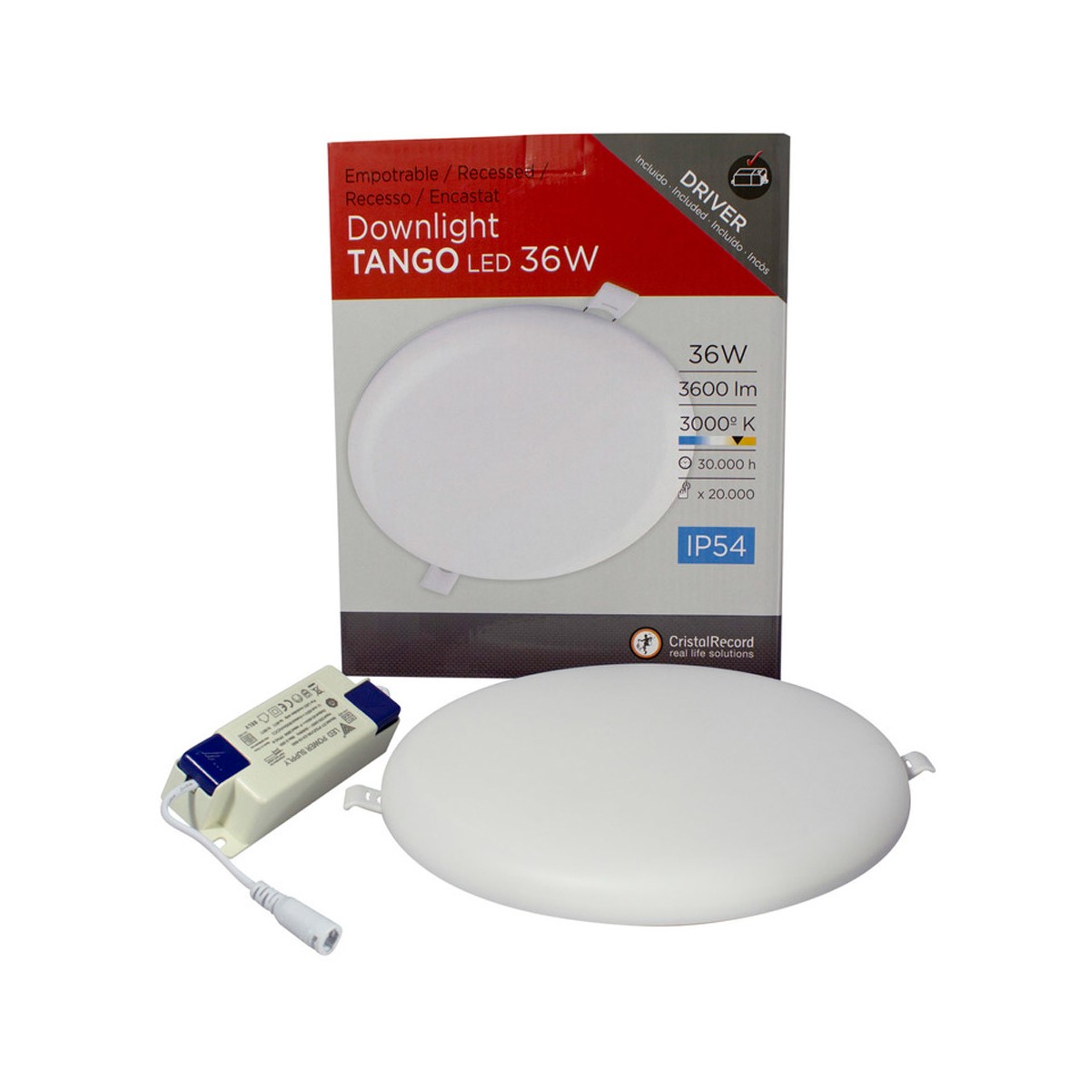 Downlight LED empotrable de 36W con alta luminosidad, 100lm/W. Downlight apto para baño para agujeros estándar de 21cm. Sin marco. Disponible en tres tonos diferentes de luz.