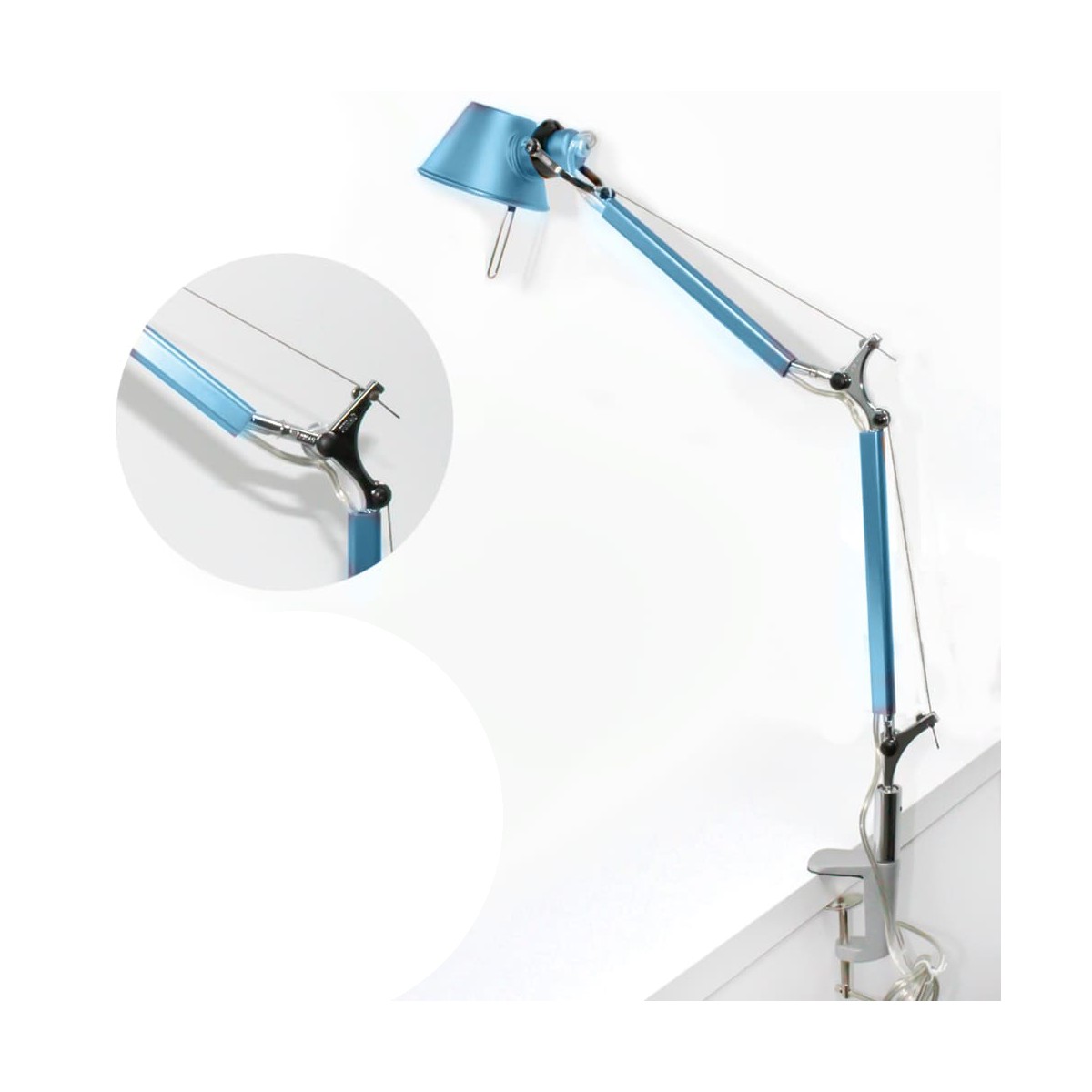 Flexo con cuerpo metálico articulado con acabado en color azul con mordaza. Dimensiones: 82x 19 x 14 cm. Cada brazo mide 26 cm