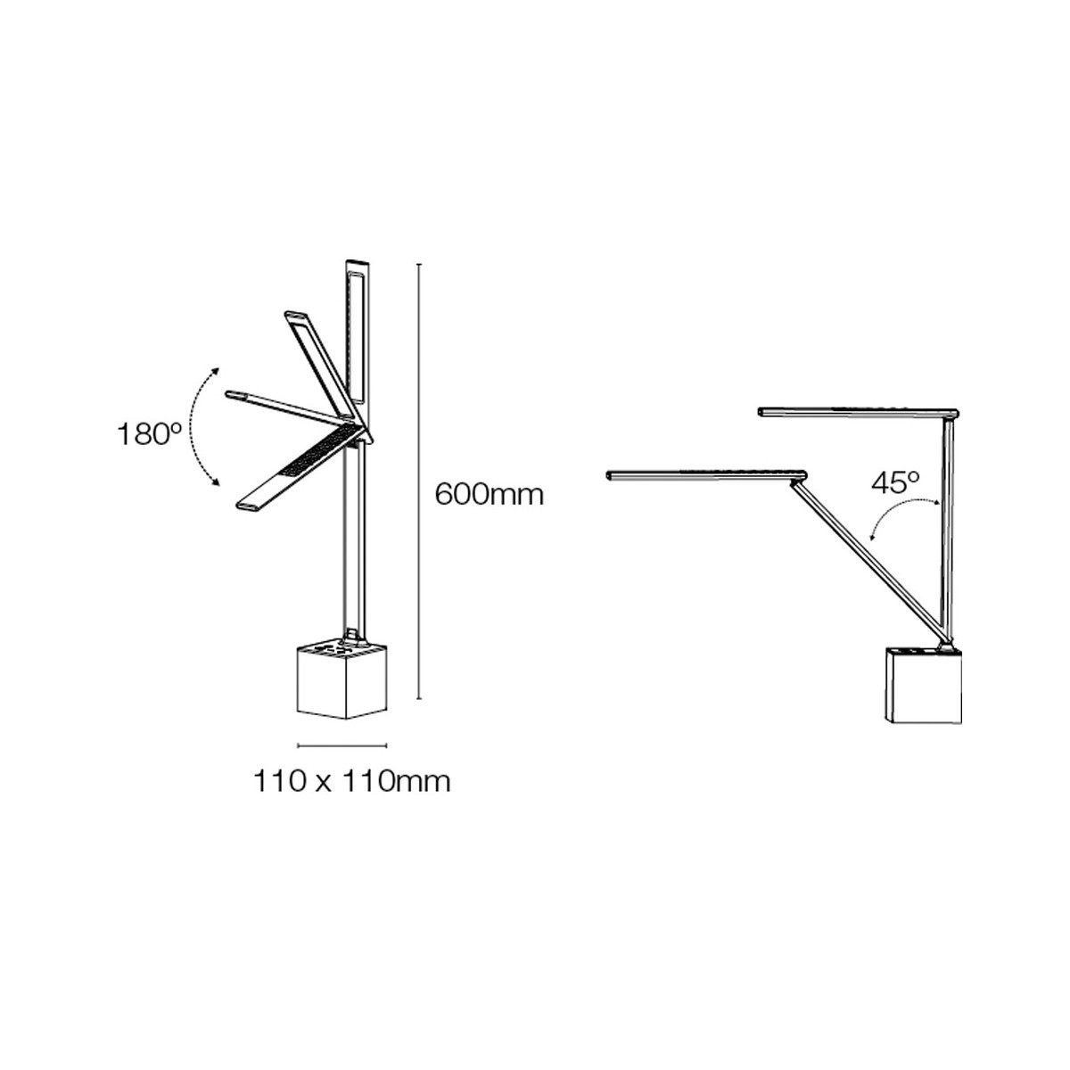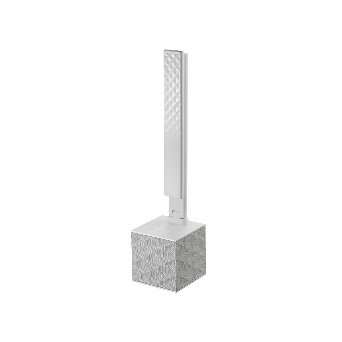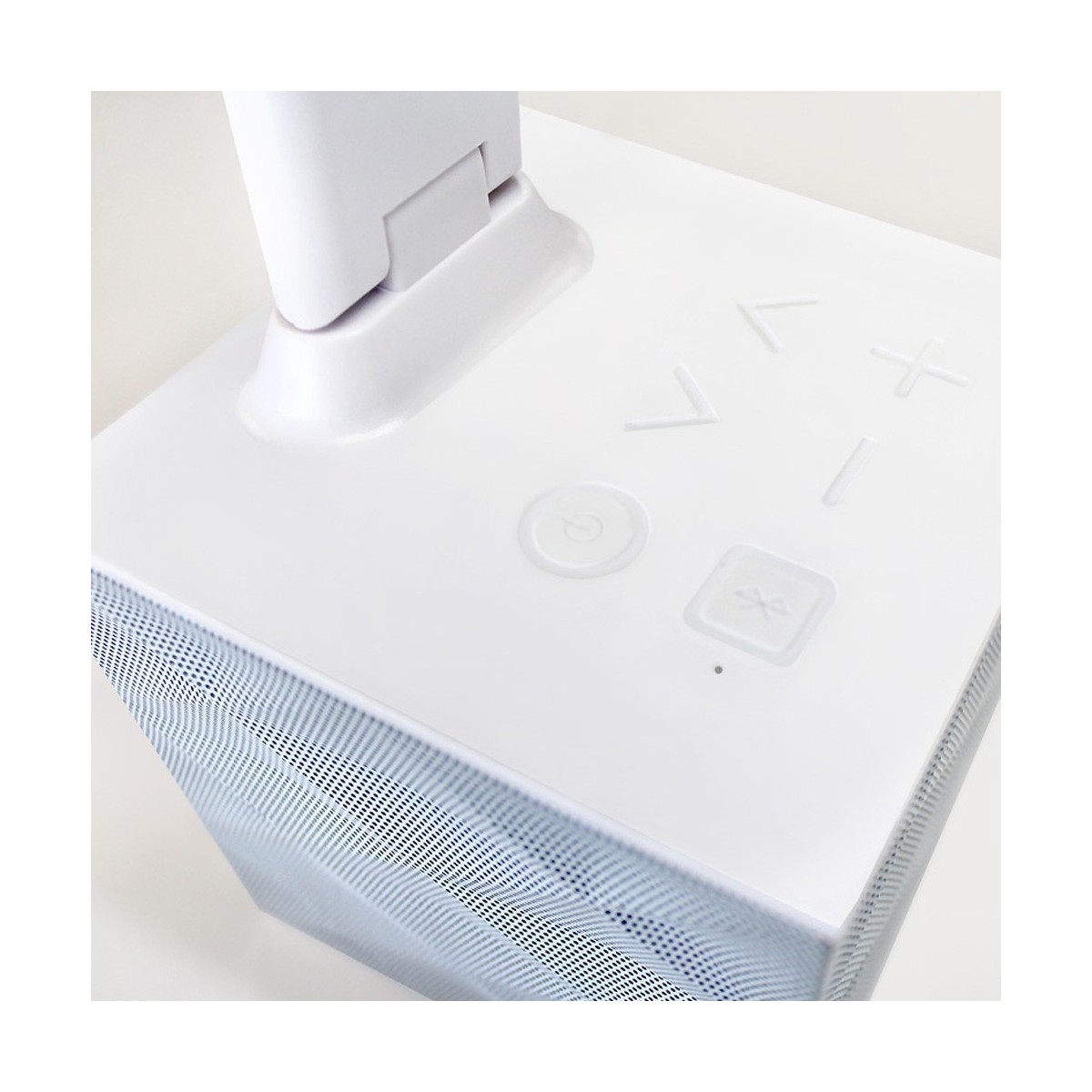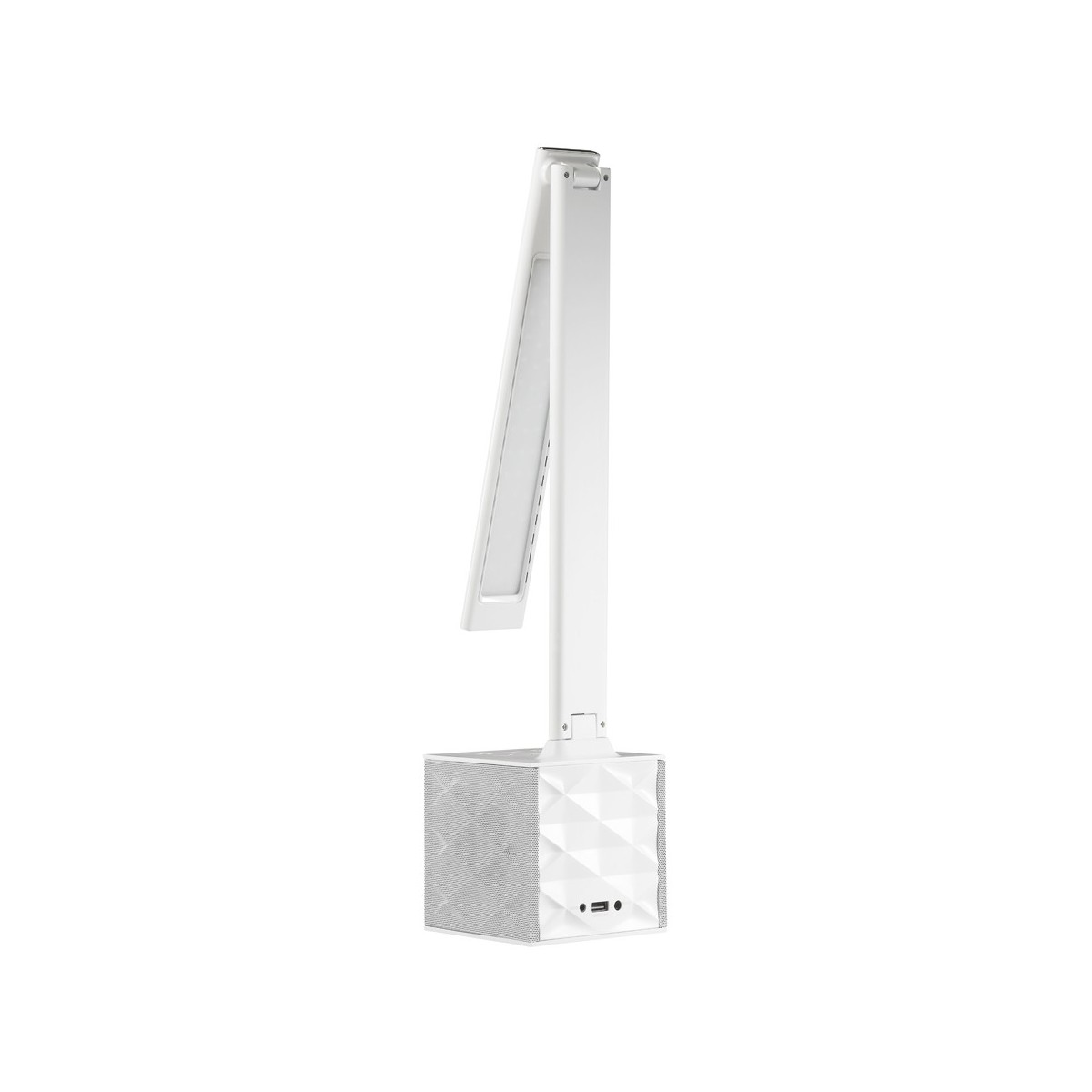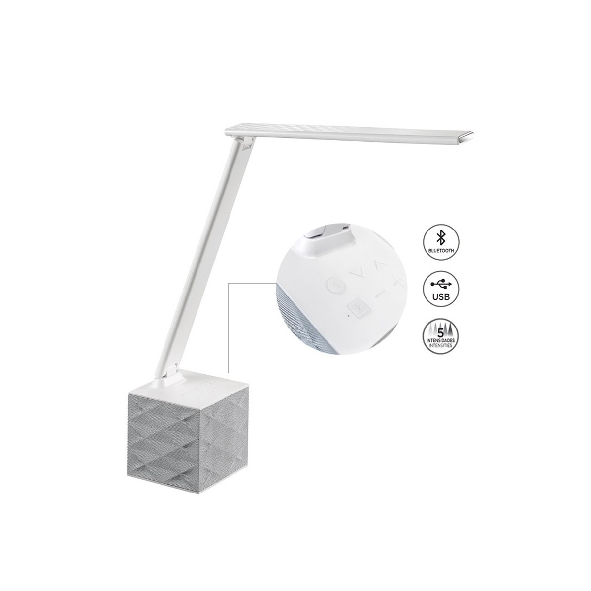 Flexo de LED con 12W y 5 intensidades de luz. Puede inclinarse 45º y orientable en 180º. Bluetooth speaker de 10W y conector USB. Altura 600mm