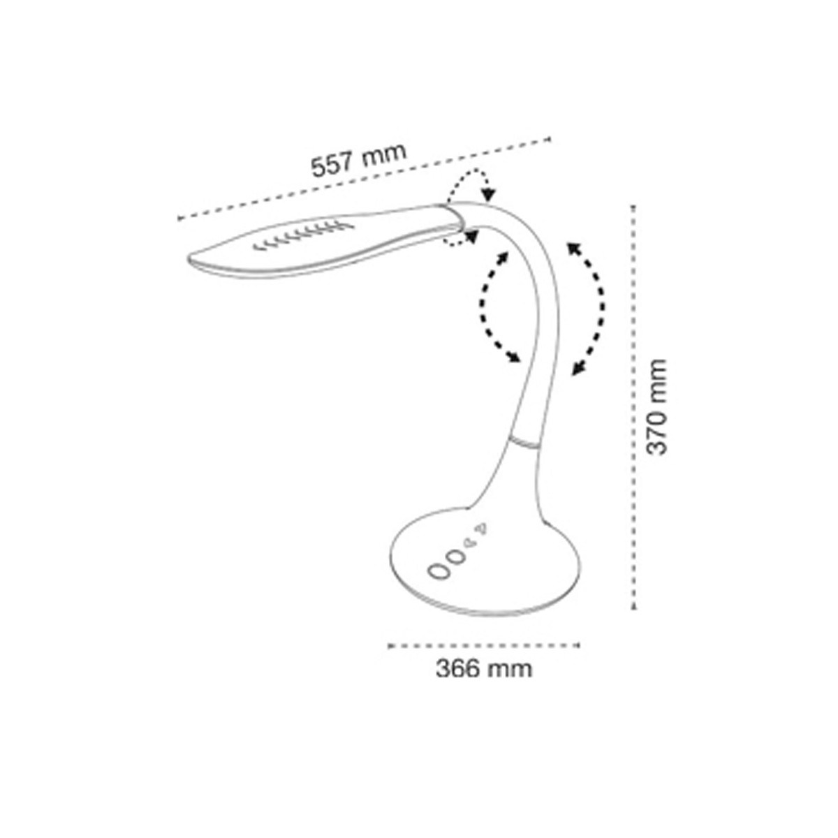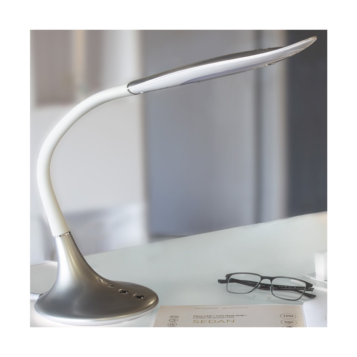 Flexo con iluminación LED integrada de 10W, 550lm. Regulable en intensidad con cambio de temperatura (3000K-6000K) con sensor táctil. Estructura de ABS flexible.