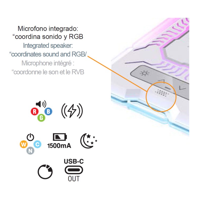 - Micrófono integrado en la base: La luz RGB cambia al ritmo de la música