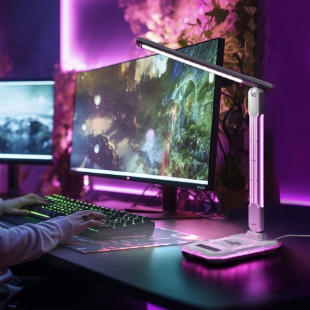Flexo LED con luz RGB para setup gamer. Complementa tu setup gamer con este flexo con luz LED RGB creando un ambiente único. Puedes fijar un color de luz, una secuencia de colores o establecer un modo en el que la luz varía al ritmo de la música (micrófono integrado en la base). Puedes cargar el móvil dejándolo en la base (solo smartphones compatibles) o a través de un cable USB-C. Flexo ideal para colocar junto al monitor y el teclado RGB mientras juegas a videojuegos online o mientras hacer streaming.