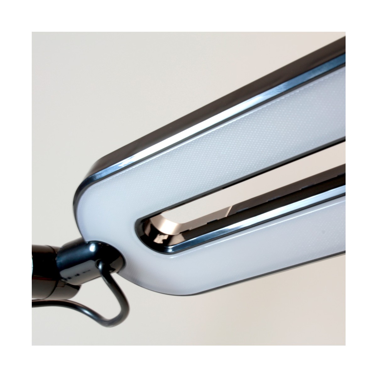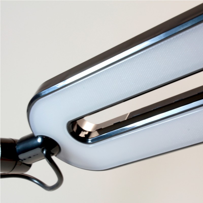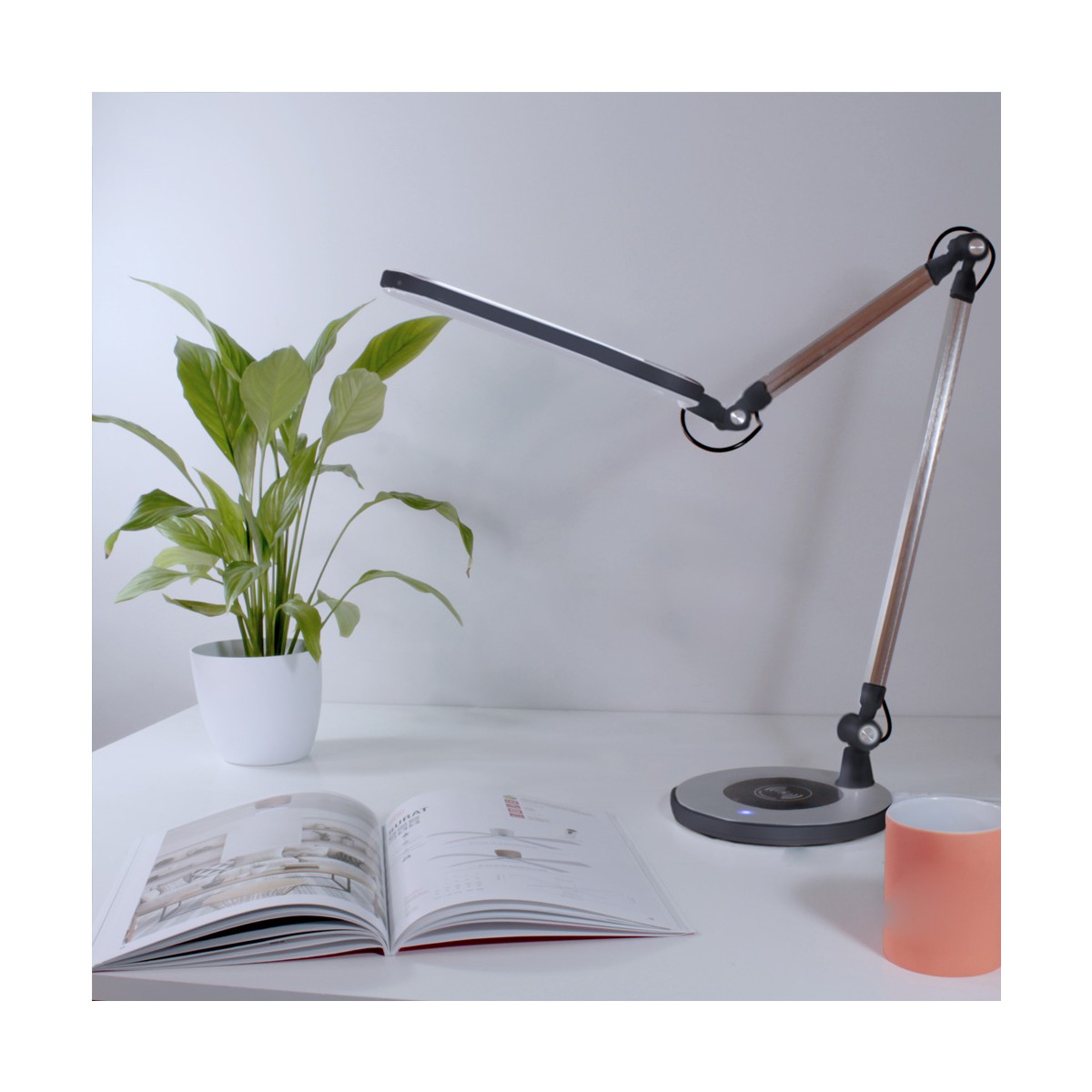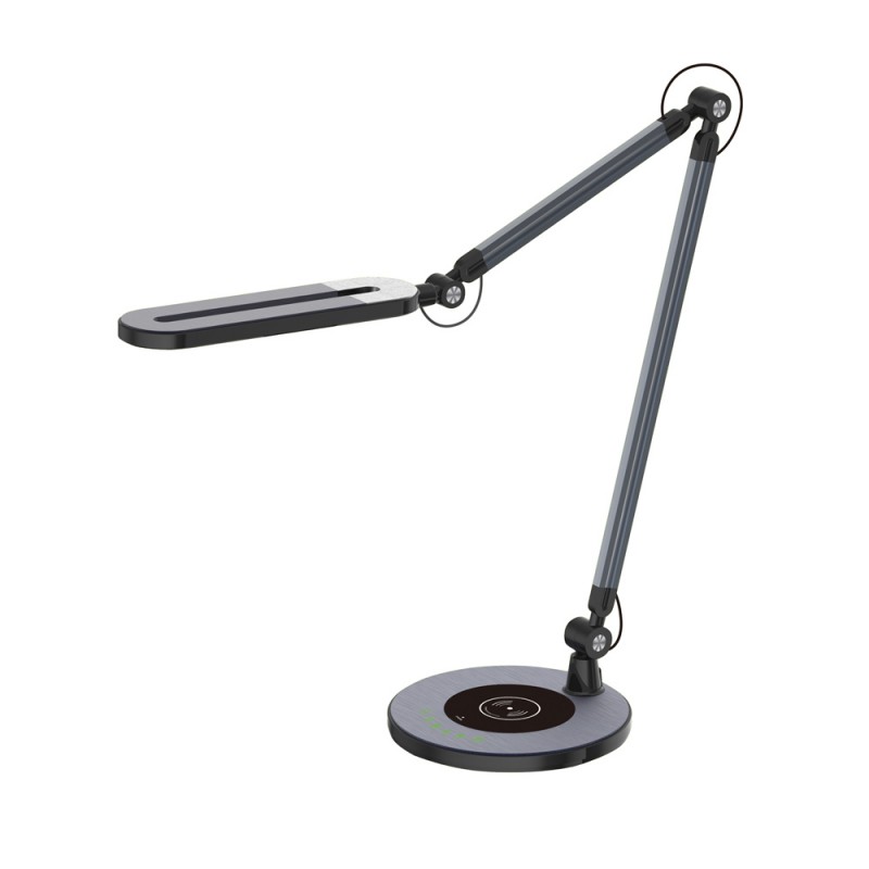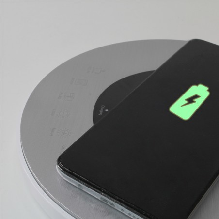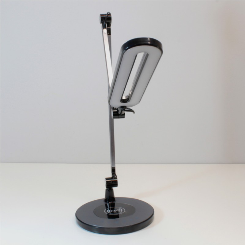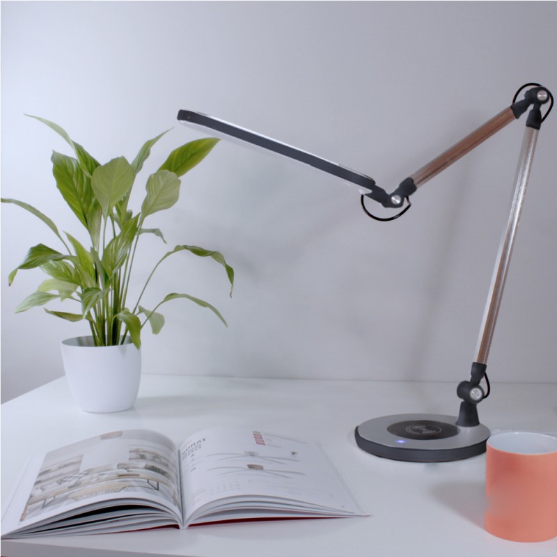 Flexo con iluminación LED de 10W con tres tonos de luz; cálida, fría y neutra. Intensidad regulable lo que permite crear diferentes iluminaciones ajustándose a todas las necesidades. Además, la estructura es articulable para dirigir la iluminación. Incluye en la base un cargador wireless que permite cargar los teléfonos móviles compatibles con esta función.