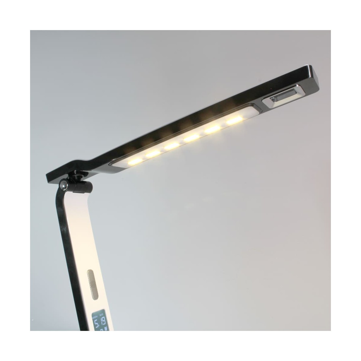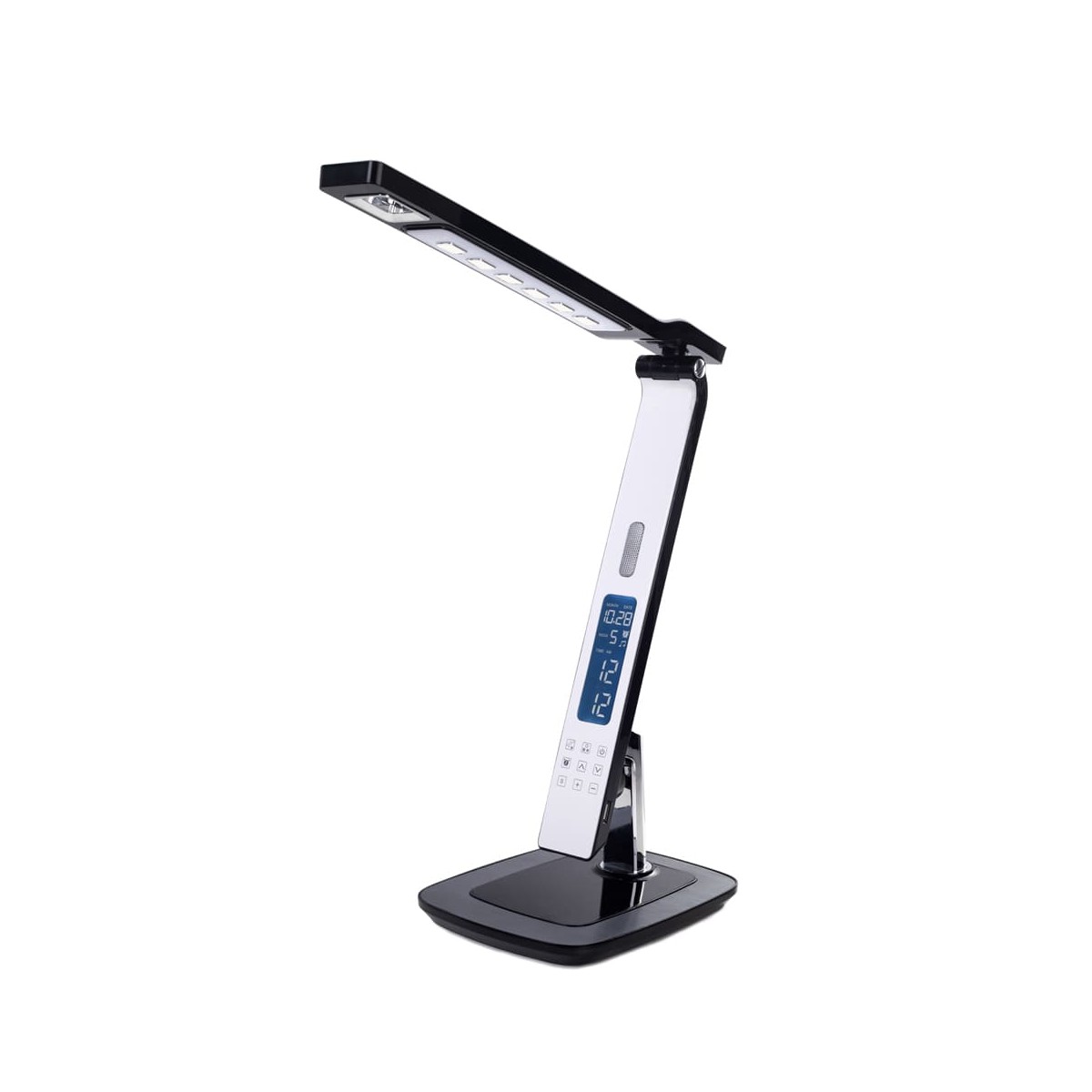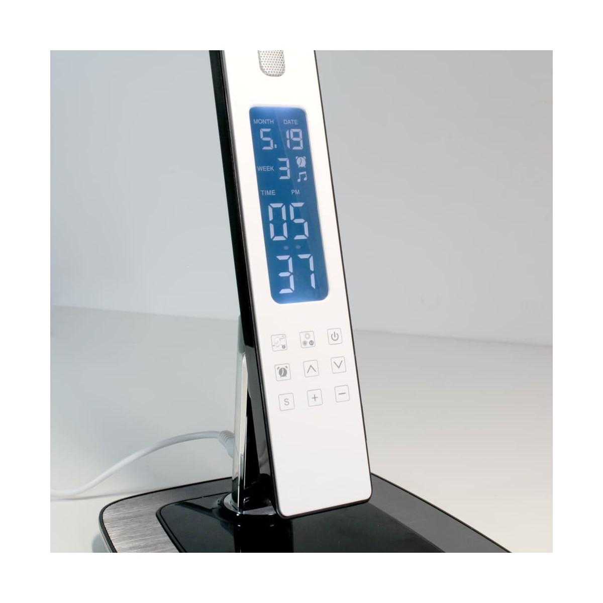 Flexo Led de 10W con tres tonalidades y 6 intensidades de luz. Permite establecer una alarma despertador y una prealarma. Pantalla LCD digital con fecha y hora y puerto USB que permite cargar dispositivos electrónicos. La prealarma puede establecerse 0-2-5-10-15 minutos antes de que suene la alarma, en su momento las luces comenzarán a encenderse de manera gradual acompañada de un sonido de pájaros. El flexo tiene el cuerpo y cabezal orientables. Es táctil, muy sencillo de utilizar con los botones de debajo de la pantalla.