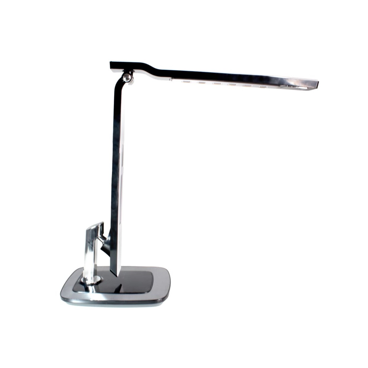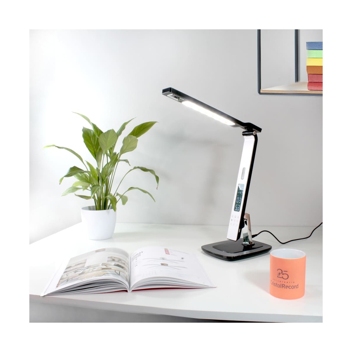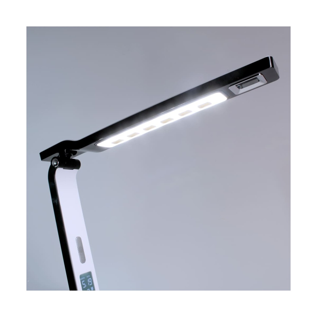 Flexo Led de 10W con tres tonalidades y 6 intensidades de luz. Permite establecer una alarma despertador y una prealarma. Pantalla LCD digital con fecha y hora y puerto USB que permite cargar dispositivos electrónicos. La prealarma puede establecerse 0-2-5-10-15 minutos antes de que suene la alarma, en su momento las luces comenzarán a encenderse de manera gradual acompañada de un sonido de pájaros. El flexo tiene el cuerpo y cabezal orientables. Es táctil, muy sencillo de utilizar con los botones de debajo de la pantalla.