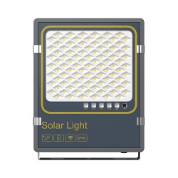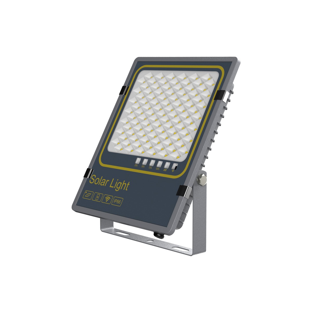 Proyector LED con panel solar con grado IP66. Proyector diseñado para aportar un gran flujo de luz en jardines, terrazas y fachadas. Cuenta con un panel solar con batería, el cual permite cargar el proyector utilizando la luz del sol. Puedes controlar la intensidad de luz del proyector con el mando a distancia, además de fijar el tiempo de apagado (3-5-8h). Ideal para iluminar zonas de paso de terrazas y jardines gracias a su sensor crepuscular y de movimiento. Luz blanca cálida de 100W.