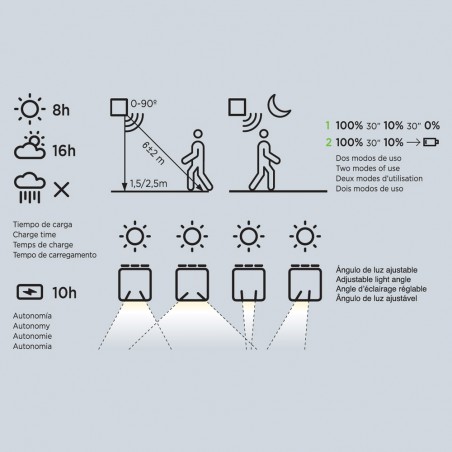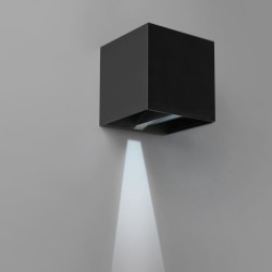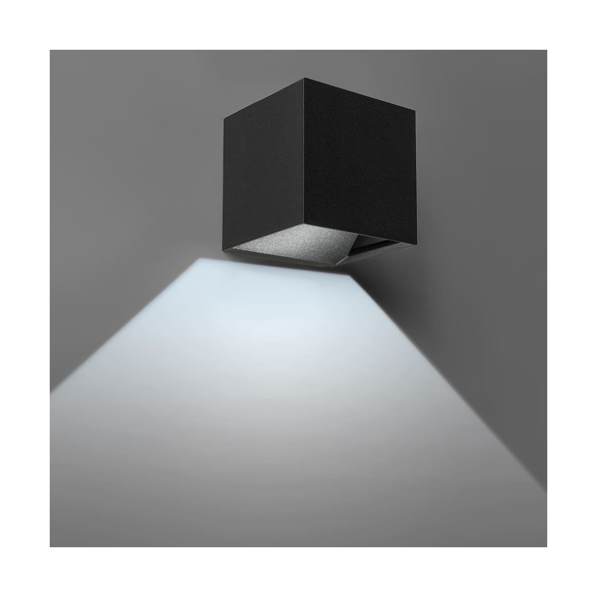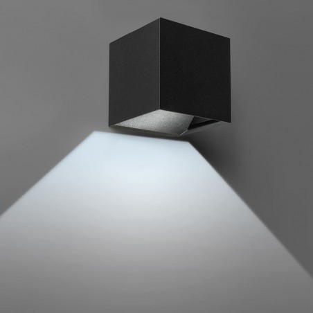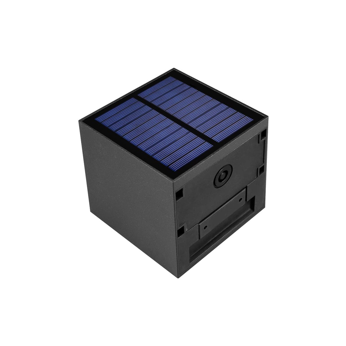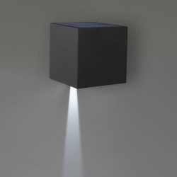 Aplique de pared LED Open con panel solar. Este aplique de forma de cubo es muy práctico para iluminar zonas de paso en jardines, porches y terrazas. Puedes ajustar el ángulo de apertura de la luz (0º-120º) y cuenta con un sensor de movimiento con dos configuraciones. La batería del aplique se carga con la luz del sol gracias al panel solar situado en la parte superior. Fabricado en aluminio color gris antracita.