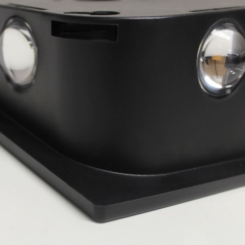 Aplique de pared LED Calm para iluminación exterior. El aplique cuenta con seis puntos de luz de modo que tres se proyectan en una dirección y tres en otra iluminando la pared. Lleva integrado un sensor de movimiento para configurar el aplique de modo que se encienda al detectar presencia en el entorno. Panel solar en la parte frontal del aplique para cargarlo durante el día con la luz del sol. Iluminación LED con dos temperaturas de color seleccionables (3000K o 6000K).