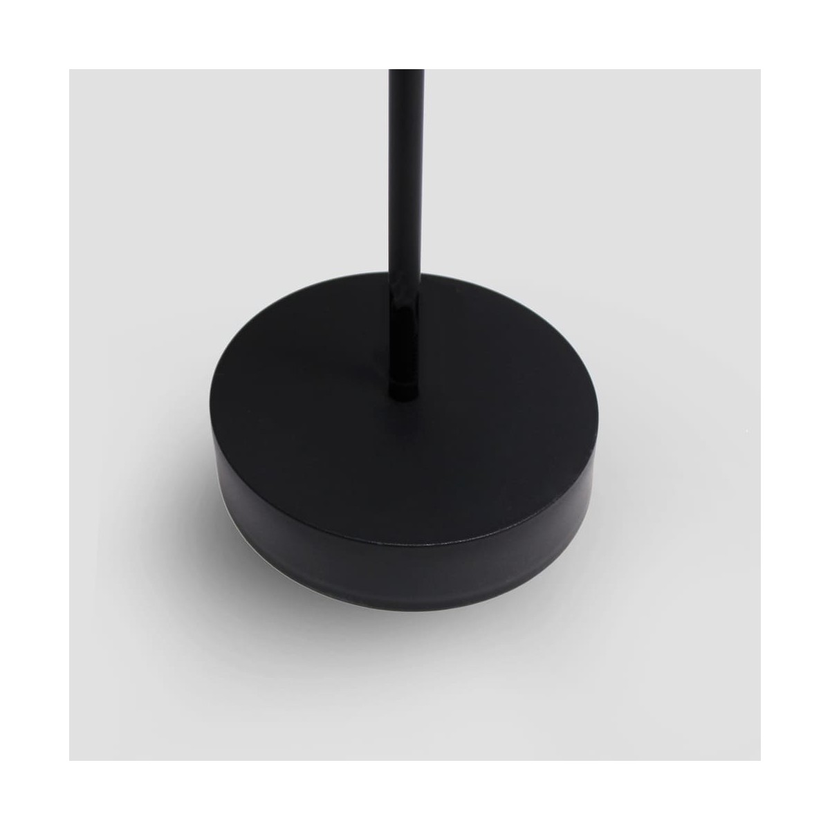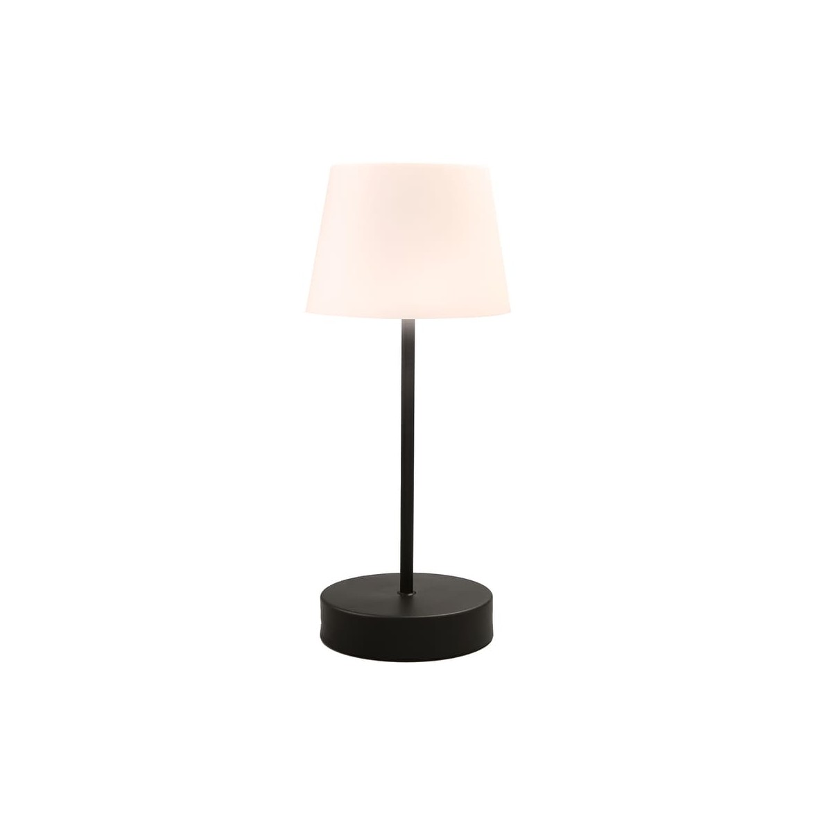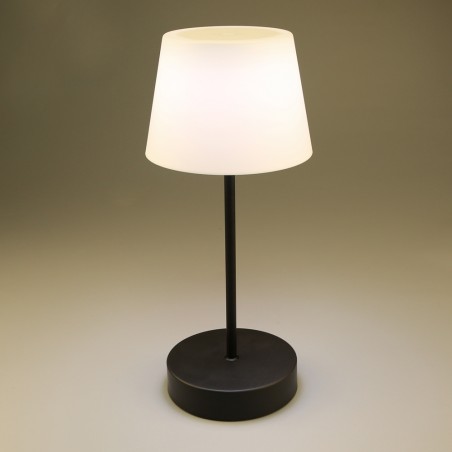 Lámpara de mesa con batería recargable para jardines y terrazas. Lámpara de mesa moderna diseñada para aportar una cálida iluminación en cenas y reuniones al aire libre. La luz se enciende de manera sencilla pulsando en la parte superior de la pantalla. Además, puedes cambiar la intensidad de lúmenes según el número de toques (100%-50%-10%-OFF). En la base tiene un puerto USB para cargar la batería de la lámpara (autonomía de hasta 10 horas). Lámpara de color negro con pantalla opal.