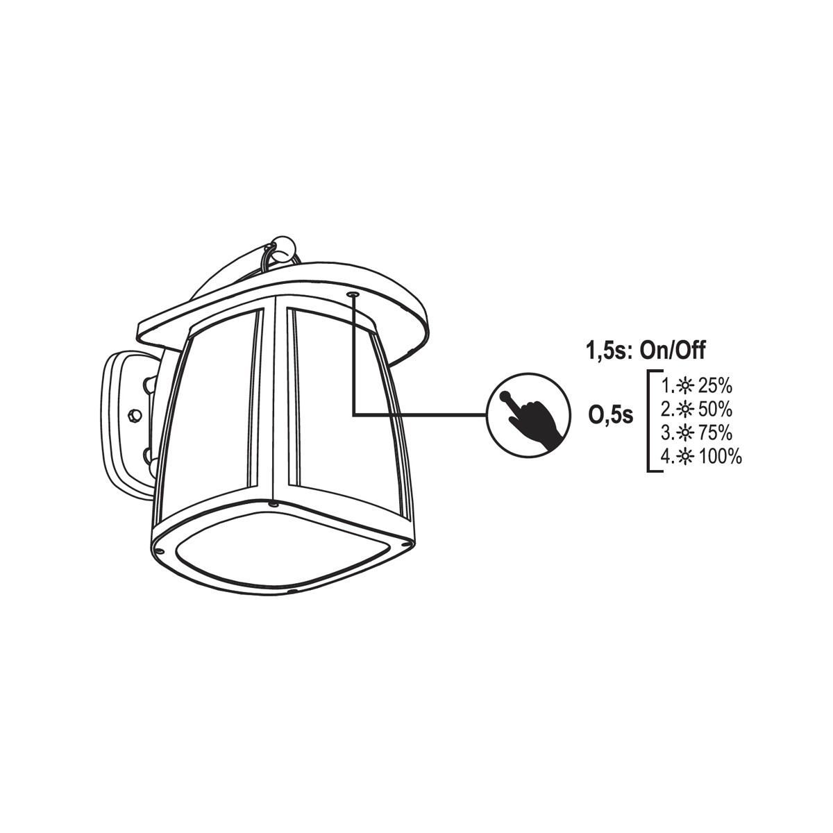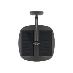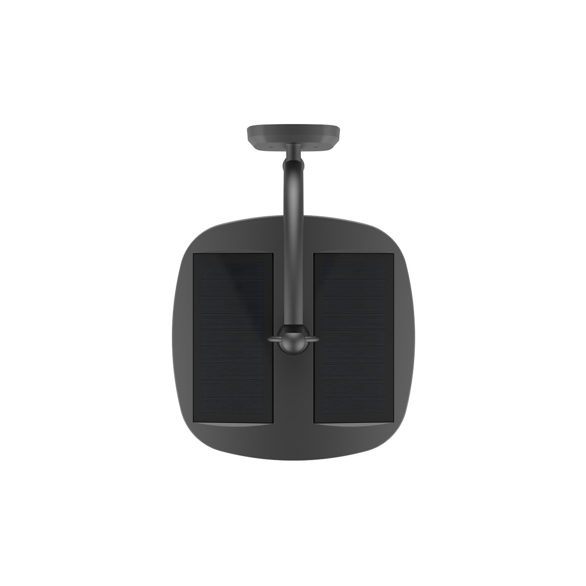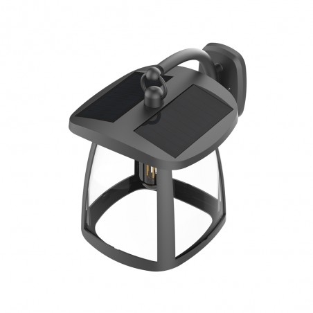Aplique de pared solar LED Zeffa. Aplique de pared con panel solar de carga para iluminación exterior. Estructura de plástico de color negro y difusores transparentes. Mediante un pequeño interruptor situado en la parte frontal puedes seleccionar entre 4 intensidades de luz (25-50-75-100%). Panel solar en la parte superior para cargar la batería y utilizar sin consumo energético. Grado IP54 frente a posibles salpicaduras de agua provocadas en el entorno.