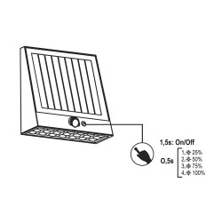 Aplique de pared solar LED Raksa. Aplique de pared con panel solar de carga en la parte frontal. Mediante un pequeño interruptor puedes seleccionar entre 4 intensidades de luz (25-50-75-100%). La luz se mite directamente hacia abajo iluminando la pared. Panel solar en la parte superior para cargar la batería y utilizar sin consumo energético. Grado IP54 frente a posibles salpicaduras de agua provocadas en el entorno.