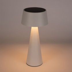 Lámpara de mesa con batería recargable Allua. Lámpara de mesa moderna diseñada para aportar una cálida iluminación en cenas y reuniones al aire libre. La luz se enciende de manera sencilla pulsando en la parte superior de la lámpara, además de poder regular la intensidad. El cabezal es magnético y se puede desmontar de la base. Puedes cargar la batería de la lámpara conectándola a la corriente o con la luz del sol gracias a su panel solar.