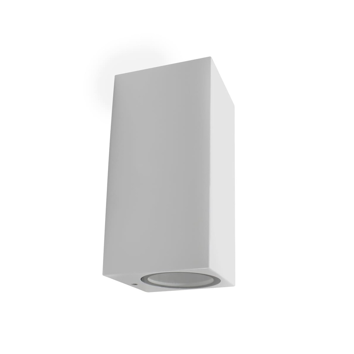 Aplique de pared para iluminación de exterior e interior. Fabricado en aluminio, tiene forma rectangular con acabado lacado en blanco mate. Resistente a salpicaduras con IP44. Fácil de instalar. El aplique Confo puedes encontrarlo disponible con una luz o con dos, para bombillas GU10 no incluidas.