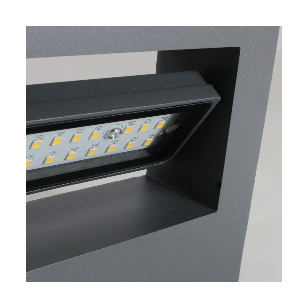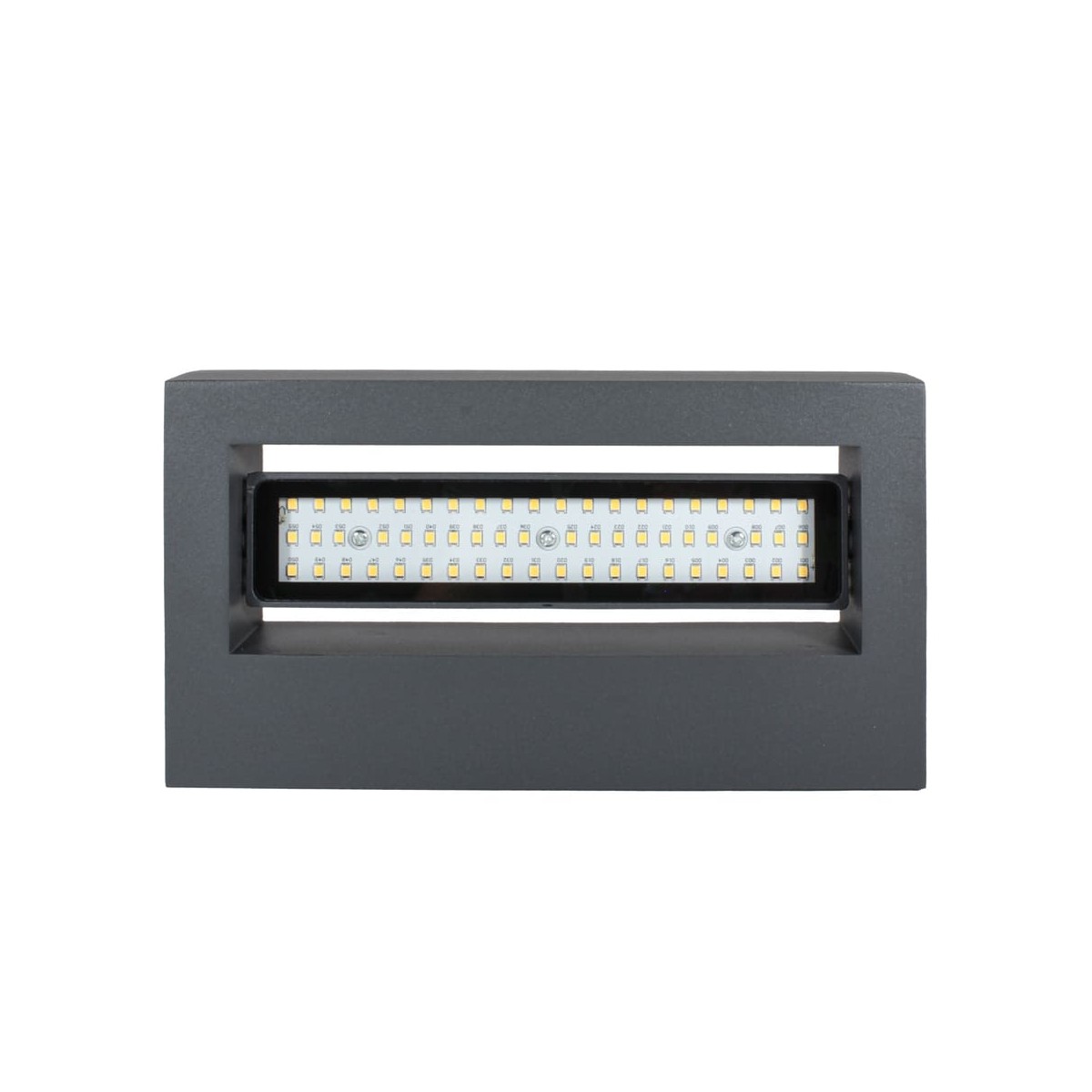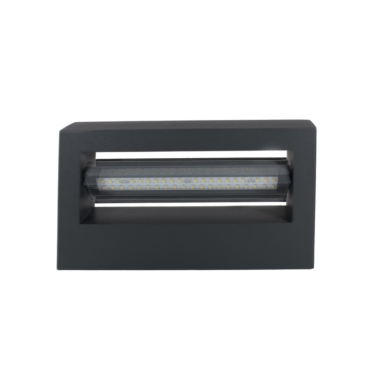 Aplique de exterior con iluminación led integrada de 12W. Luz blanca natural con 850lm. El aplique rectangular de color gris antracita es fijo pero permite orientar la fuente de luz 180° permitiendo crear diferentes iluminaciones y ambientes. Muy resistente al agua con una IP54 puede instalarse sin problemas en jardines y terrazas sin cubir.