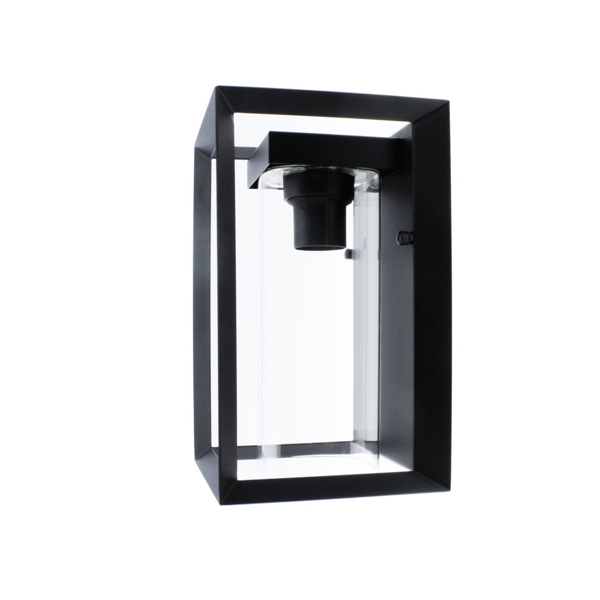 Aplique de pared para exterior, negro con tulipa de cristal transparente. Resistente a salpicaduras con IP23. Para bombilla E27 no incluida. Medidas 30x18x17,5cm.