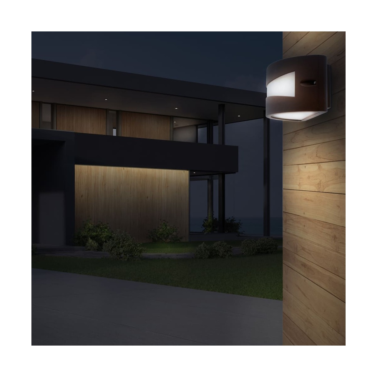 Aplique apto para exterior con IP44. Estructura de aluminio lacado en marrón óxido Con difusor blanco opaco y translucido. Para bombilla E27, no incluida.
