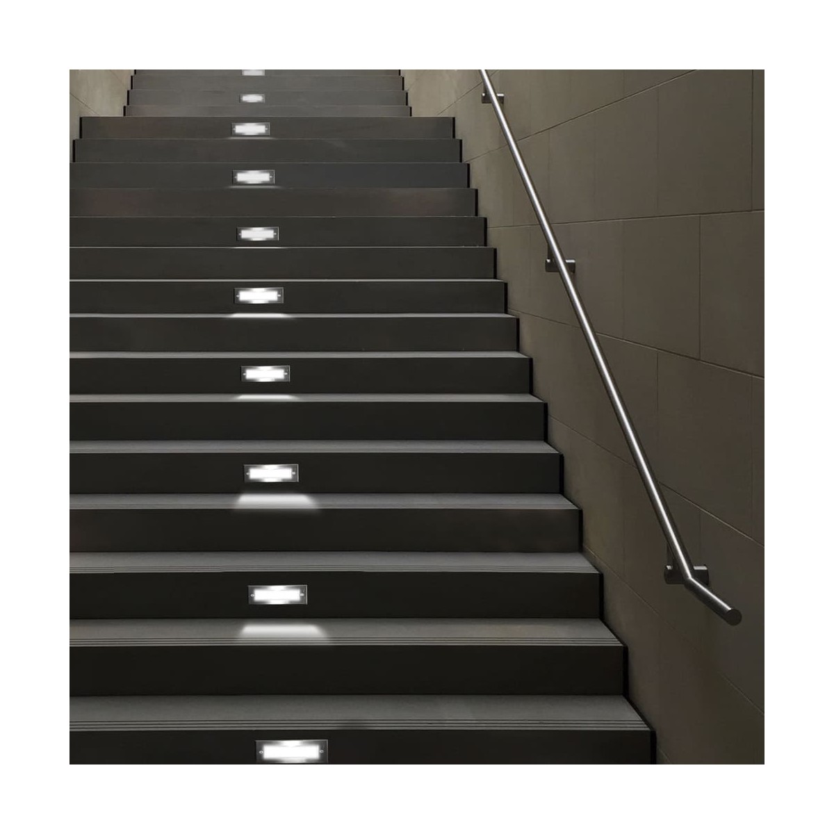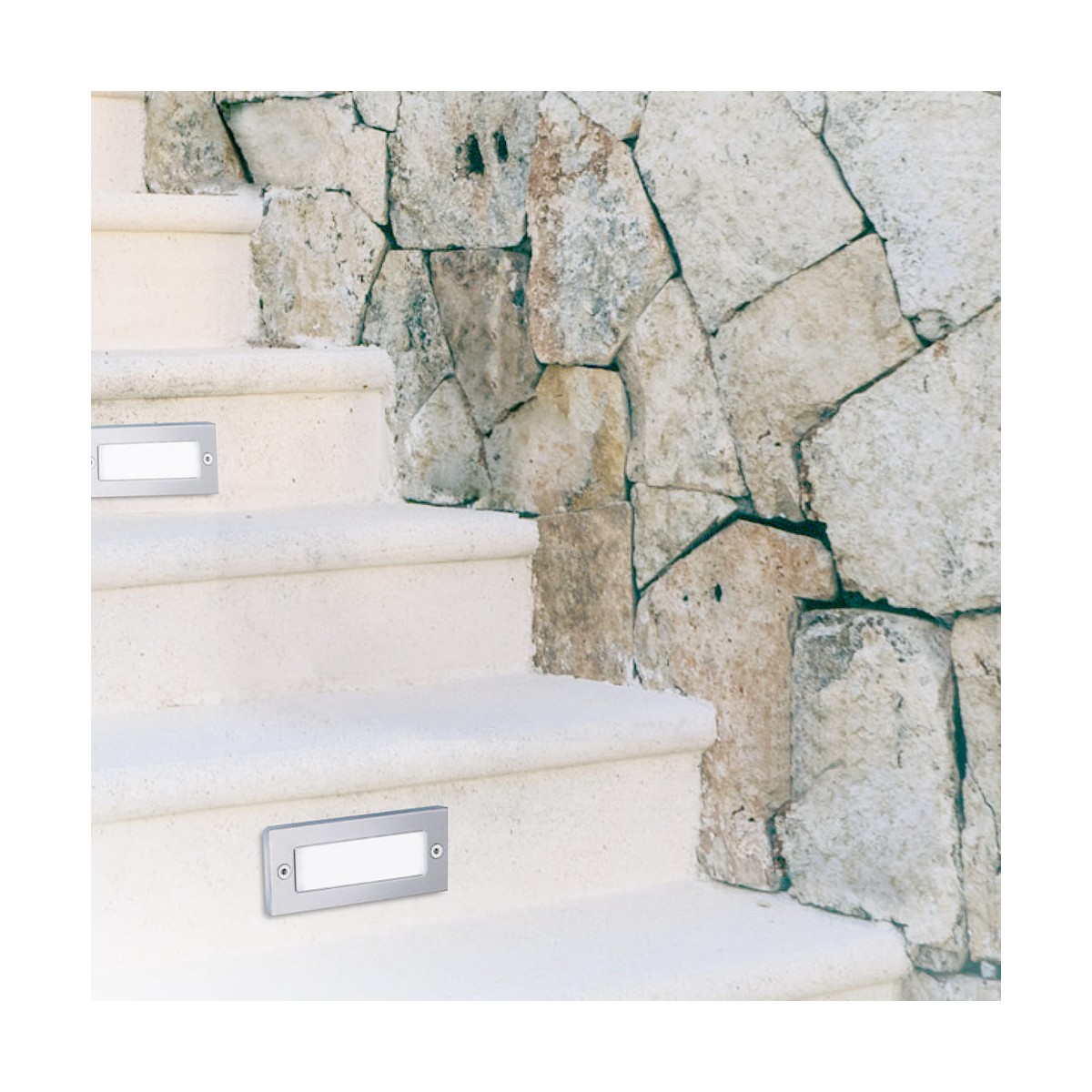 Luz de escalera con IP44, perfecta para iluminar peldaños tanto en interiores como en exteriores. Su LED de 2.4W aporta 90Lm con una temperatura de luz de 4.000ºK, Además su sistema LED cuenta con la última tecnología para ofrecer una óptima iluminación, sin el molesto efecto parpadeante (flicker).