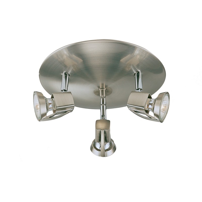 Plafón con base redonda y 3 focos en acabado niquel. Bombillas G9 no incluidas. Compatible con bombilla LED.