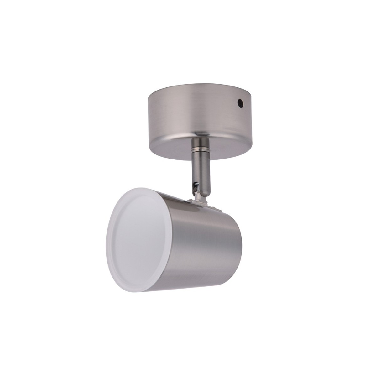 Foco con iluminación led integrada de 5W, 340lm, luz neutra de 4000K. Fabricado en aluminio y acrílico con acabado en níquel.