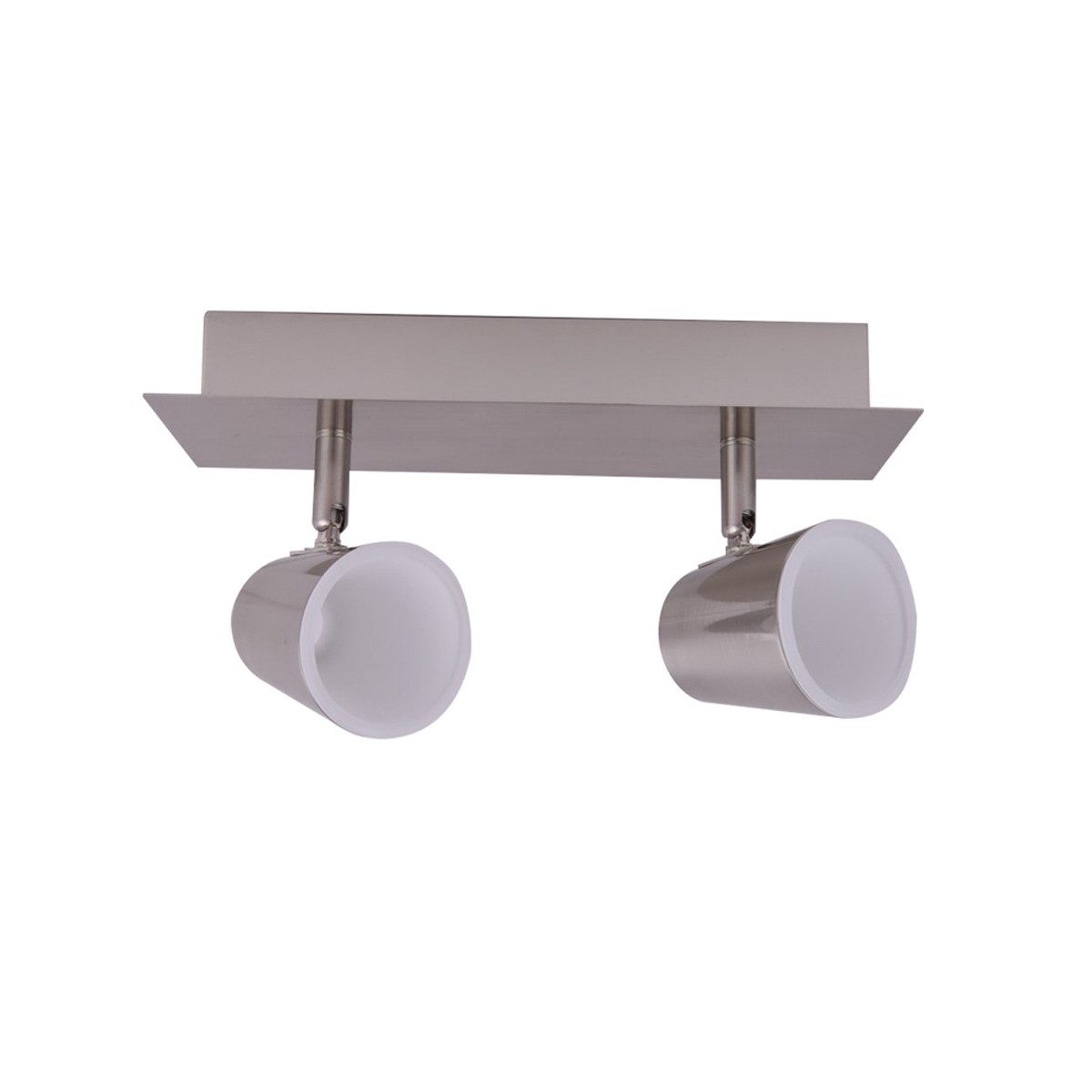 Regleta de dos focos con iluminación led integrada de 5W cada uno, 645lm, luz neutra de 4000K. Estructura de aluminio con acabado en níquel