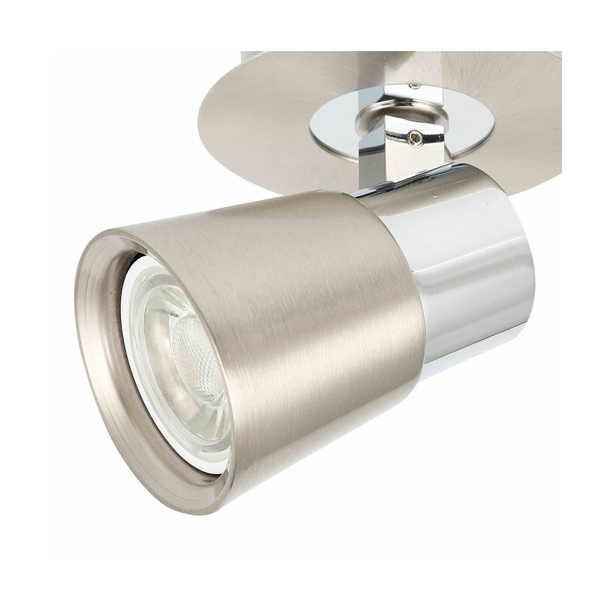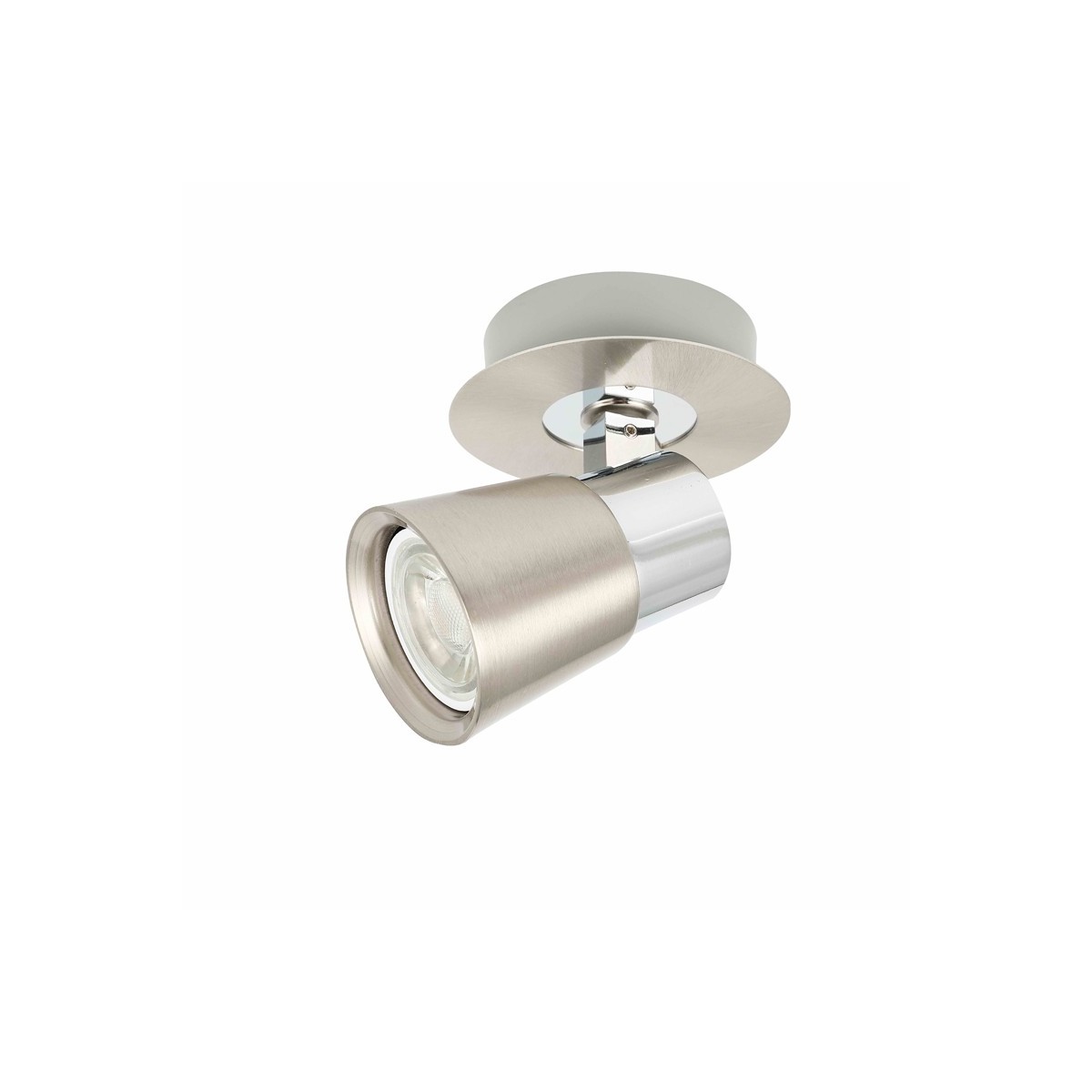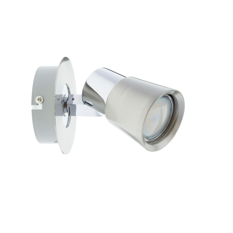 Foco basculante para bombilla GU10 fabricado en hierro, muy fácil de instalar y de reemplazar la bombilla. Este modelo tiene un acabado níquel con detalles en cromo lo que hace de este foco perfecto para decorar salones y dormitorios a la vez que diriges el foco de luz en la dirección deseada. Puedes instalarlo tanto en techos como en paredes.