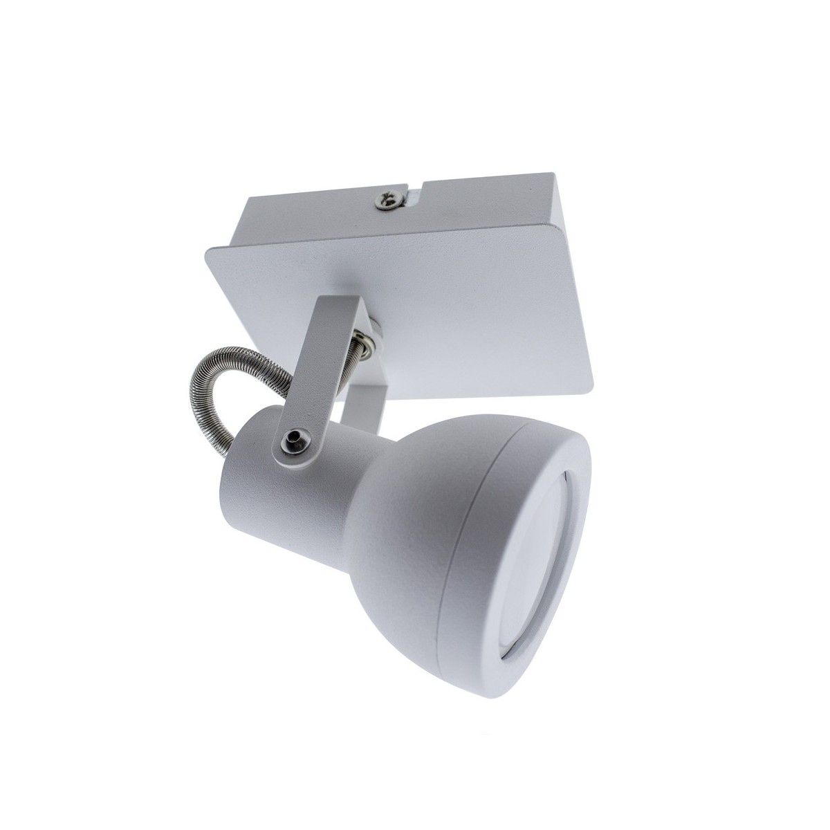 Foco basculante fabricado en hierro con acabado lacado en blanco. Apto para bombillas LED GU10, no incluidas. Puede instalarse en el teho o en la pared, permitiendo dirigir el haz de luz a un punto concreto gracias a su ángulo de basculación y rotación.