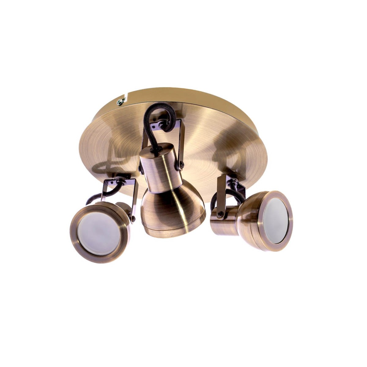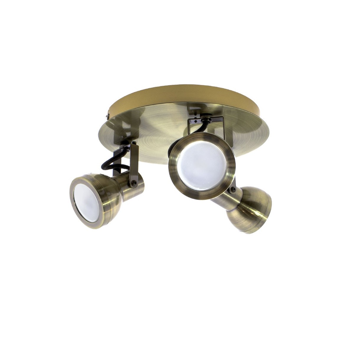 Plafón de techo con tres focos basculantes orientables para bombillas GU10. Fabricado en hierro aporta una calidad inmejorable al plafón, con un acabado en cuero muy elegante. Ideal para salones y comedores. Además el reemplazo de las bombillas (no incluidas en el producto) es muy sencillo, unicamente se debe desenroscar el aro del foco y una vez cambiada la bombilla volver a ponerlo.