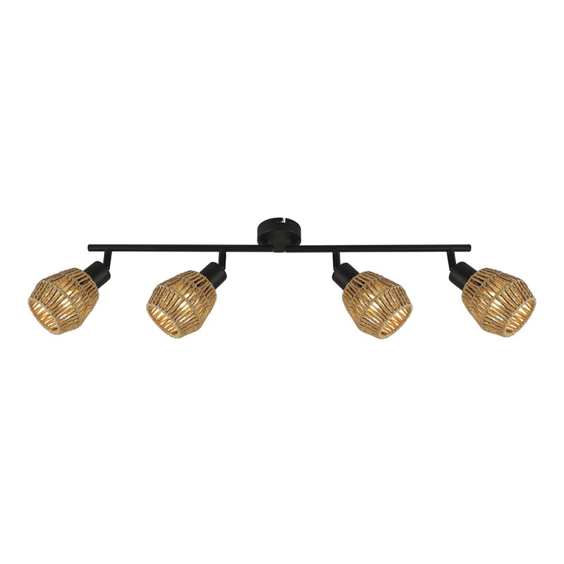 Regleta de cuatro luces Krabi. Regleta de techo boho chic compuesta por cuatro focos orientables de manera individual. Estructura metálica de color negro y pantallas de cuerdas de ratán. Perfecta para instalar como iluminación en el techo de un salón con decoración boho chic.