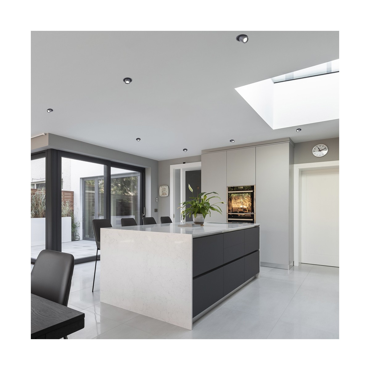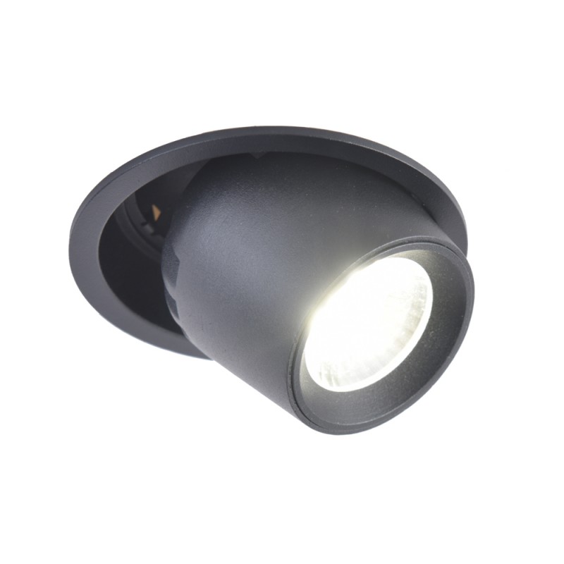 Empotrable de techo negro con foco orientable. Práctico empotrable de techo con punto de luz el cual puedes dejar escondido en el techo o sacarlo ligeramente. De este modo, la luz se proyecta directamente hacia abajo como un empotrable convencional o puedes dirigir la luz hacia uno de los lado. Ángulo de basculación de 30º. El empotrable lleva iluminación LED integrada de 8W en tono blanco neutro. Fabricado en metal de color negro.