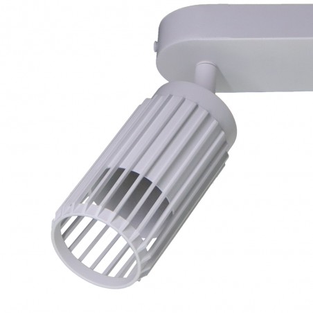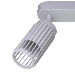 Regleta de dos focos orientables. Focos de forma cilíndrica de aluminio blanco texturizado, con un diseño en relieve con parte inferior de rejilla. Esta regleta de techo está diseñada para una iluminación decorativa y funcional de una estancia de casa. Colección Sahara.