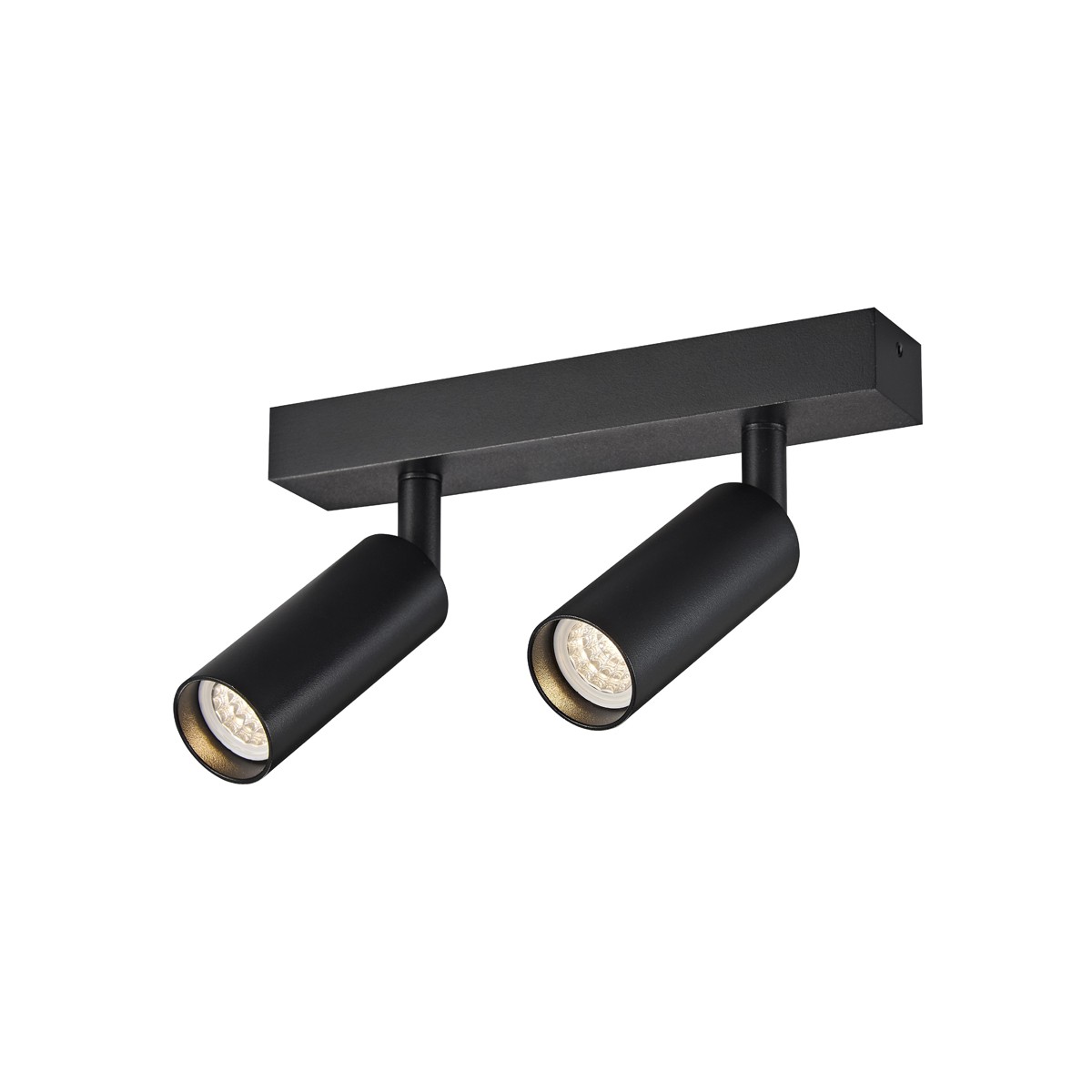 Regleta de dos focos orientables Slim. Focos tubulares de aluminio para bombillas G9 LED (no incluidas). Cada foco puede moverse para dirigir la luz al punto deseado. Acabado negro arenado. Instalación en techo o en pared. La base de 30x160 mm.