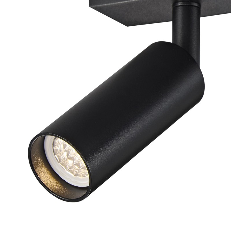 Regleta de tres focos orientables Slim. Focos tubulares de aluminio para bombillas G9 LED (no incluidas). Cada foco puede moverse para dirigir la luz al punto deseado. Acabado negro arenado. Instalación en techo o en pared. La base de 30x250 mm.