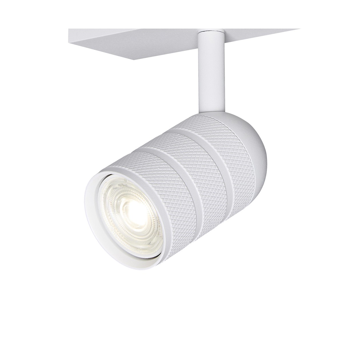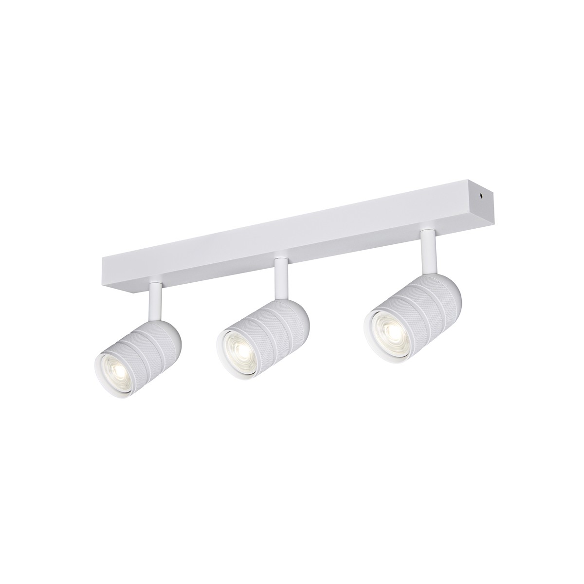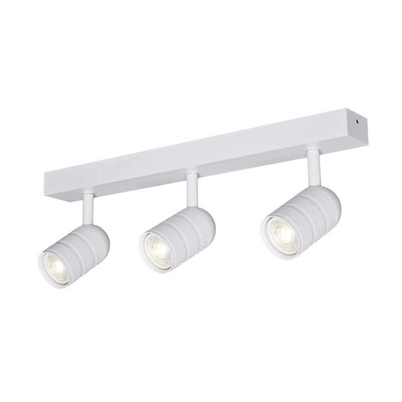 Regleta de techo con focos orientables. Los focos están diseñados para funcionar con bombilla GU10-35 (no incluidas). Cada foco puede moverse de manera individual para dirigir la luz al punto deseado. Acabado blanco arenado. La base de 40x348 mm.