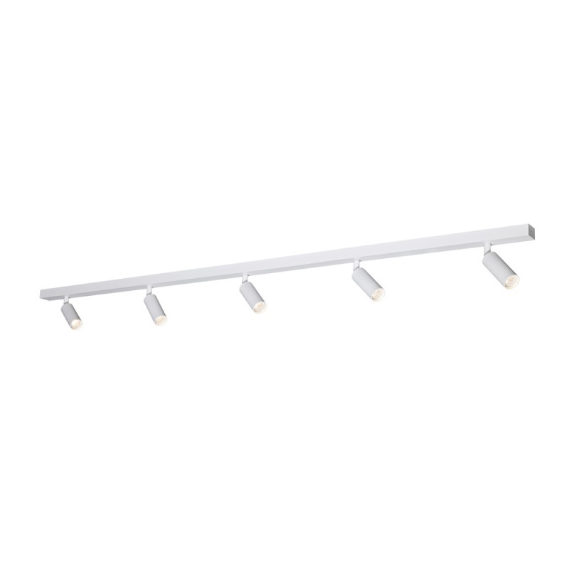 Regleta de cinco focos orientables Slim. Focos tubulares de aluminio para bombillas G9 LED (no incluidas). Cada foco puede moverse para dirigir la luz al punto deseado. Acabado blanco arenado. Instalación en techo o en pared. La base de 30x1150 mm.