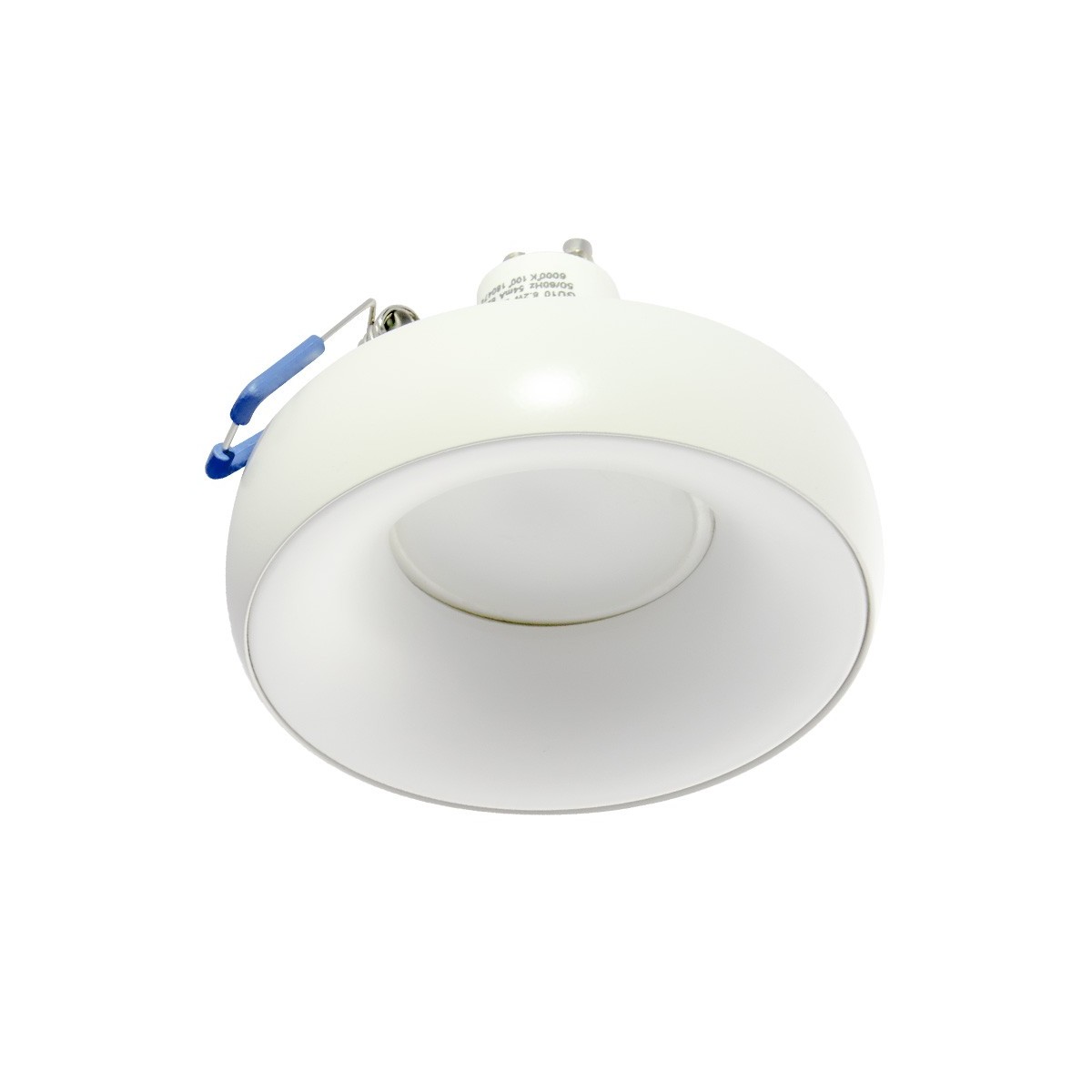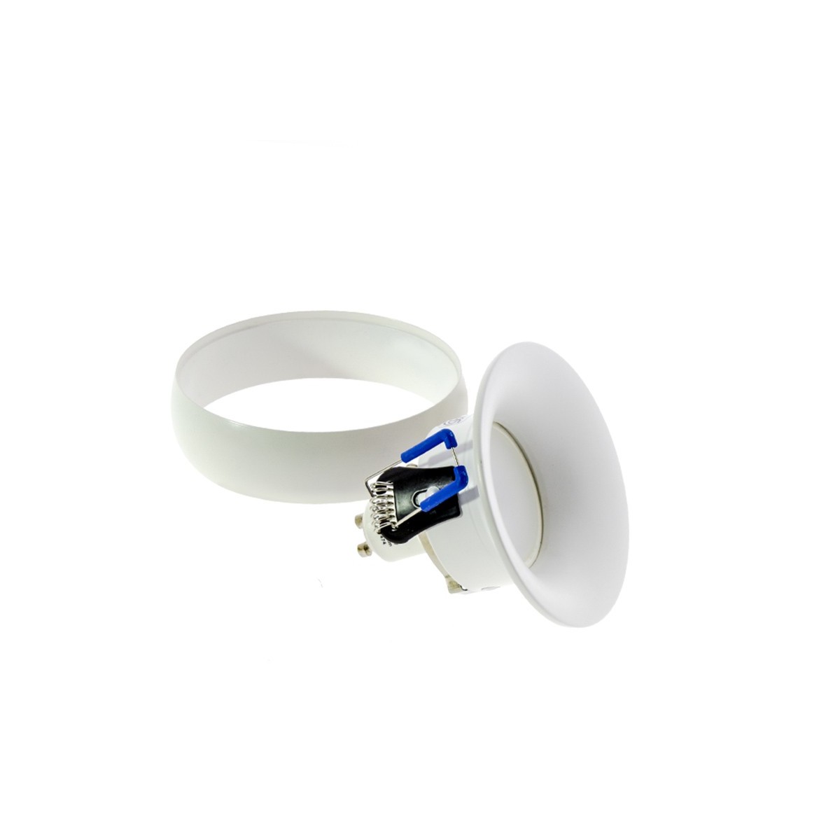 Foco empotrable redondo, apto para techos bajos para empotrar en huecos de 65mm de diámetro. Fabricado en aluminio con acabado blanco mate. Incluye un aro decorativo que hace que baje el foco. Tiene una altura de 25 mm y un diámetro exterior de 93 mm. Incluye portalámparas GU10. Disponible en 4 acabados diferentes.