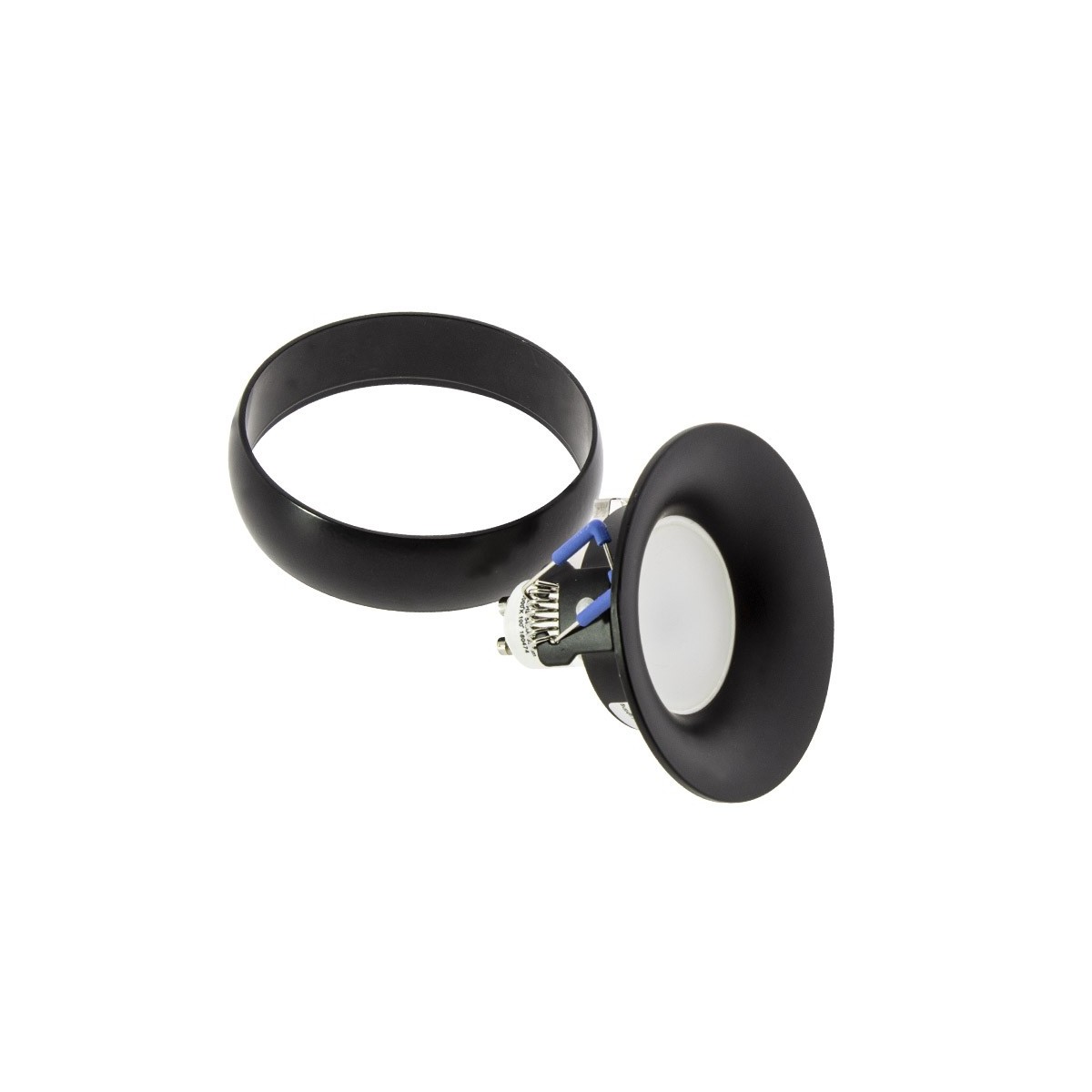 Foco empotrable redondo, apto para techos bajos para empotrar en huecos de 65mm de diámetro. Fabricado en aluminio con acabado negro mate. Incluye un aro decorativo que hace que baje el foco. Tiene una altura de 25 mm y un diámetro exterior de 93 mm. Incluye portalámparas GU10. Disponible en 4 acabados diferentes.