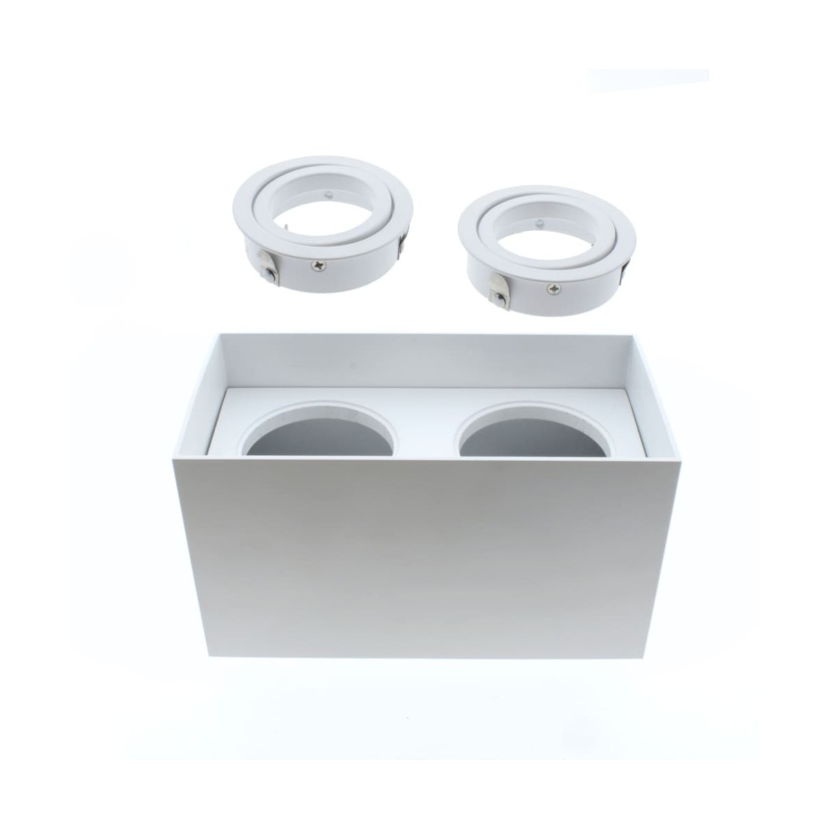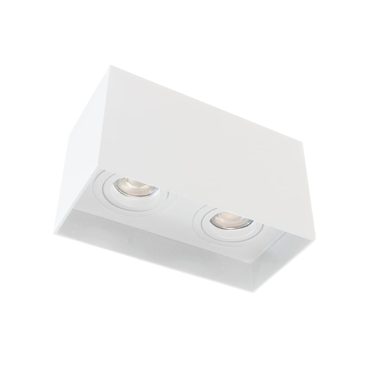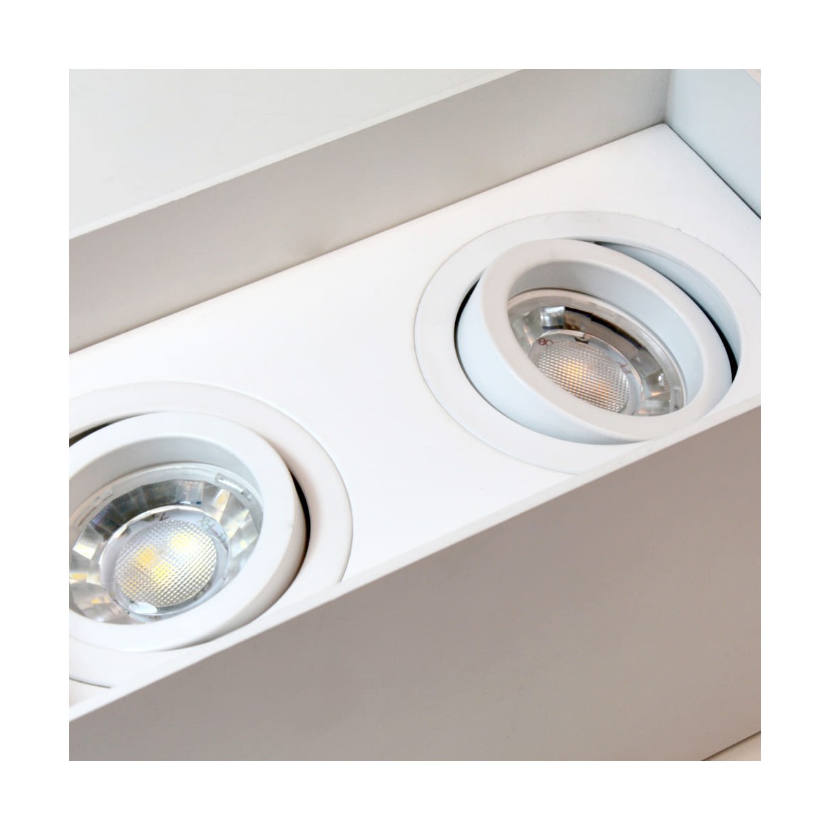 Foco de techo con dos luces basculantes, para bombillas GU10. Sencilla instalación en superficie con reemplazo de la bombilla por la parte delantera. Fabricado en aluminio con acabado blanco mate texturizado.
