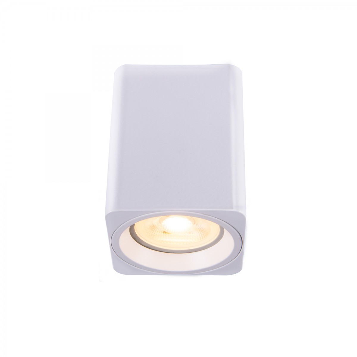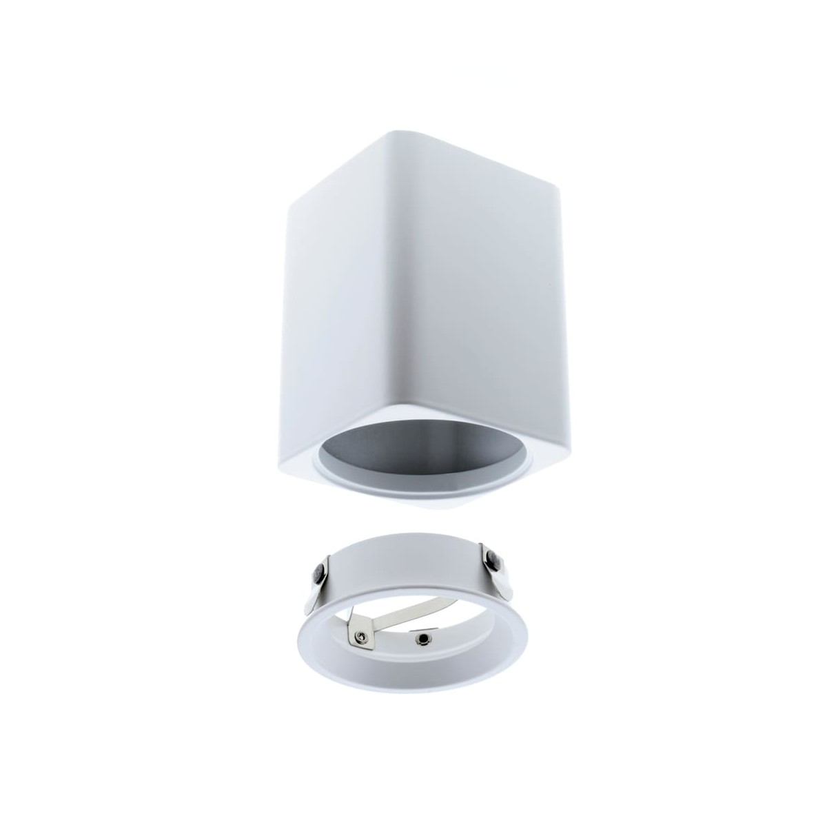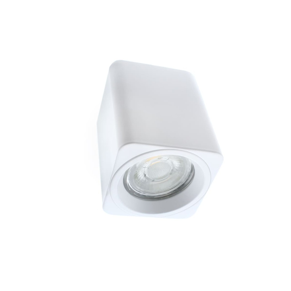 Foco fijo cuadrado para techos para bombilla GU10 (no incluida) fabricado en aluminio con acabado lacado texturizado. Sencilla instalación de superficie, con reemplazo de la bombilla por la parte delantera del foco.