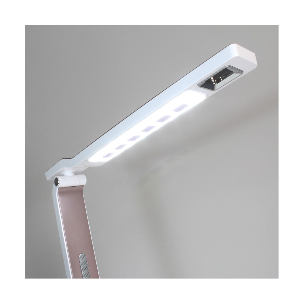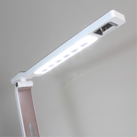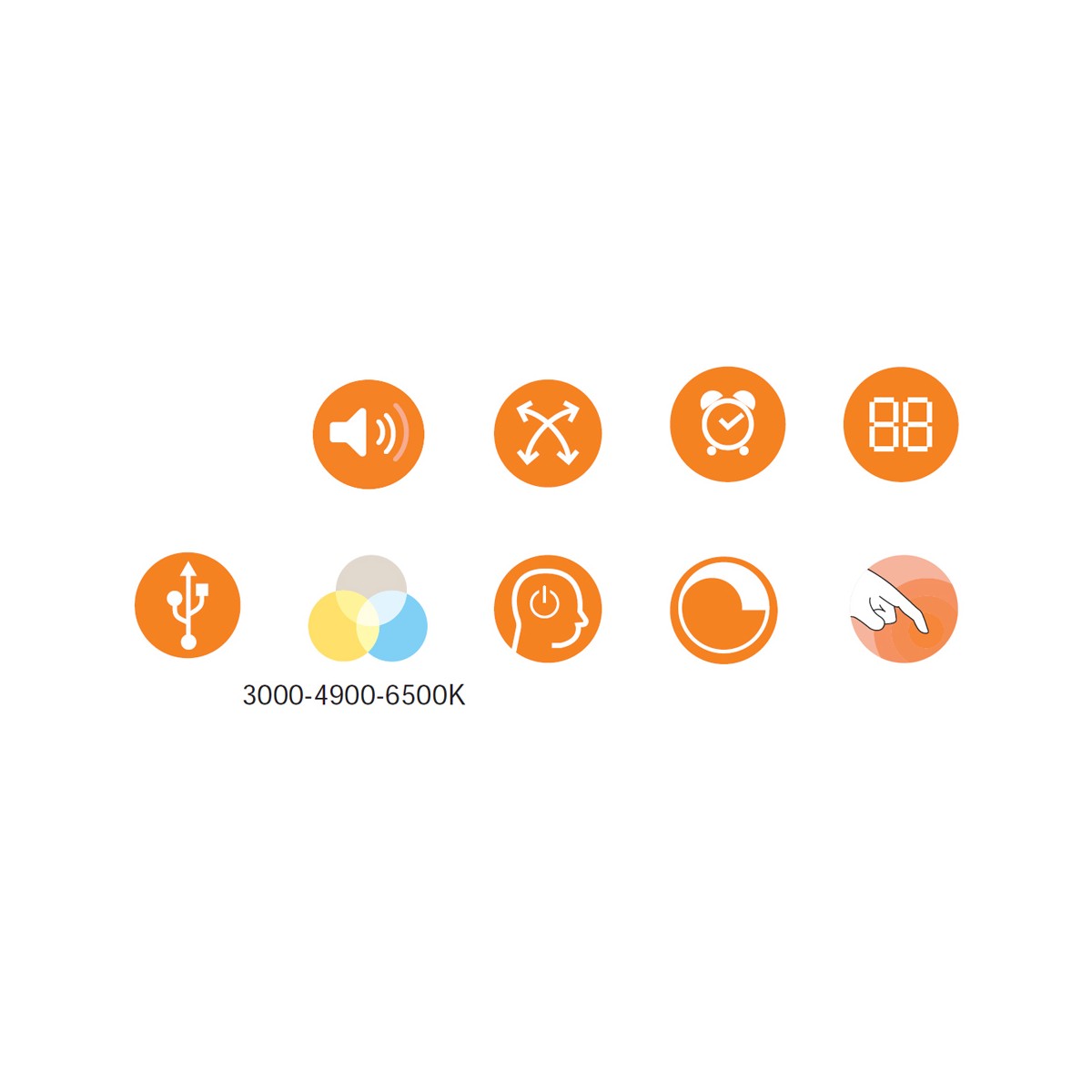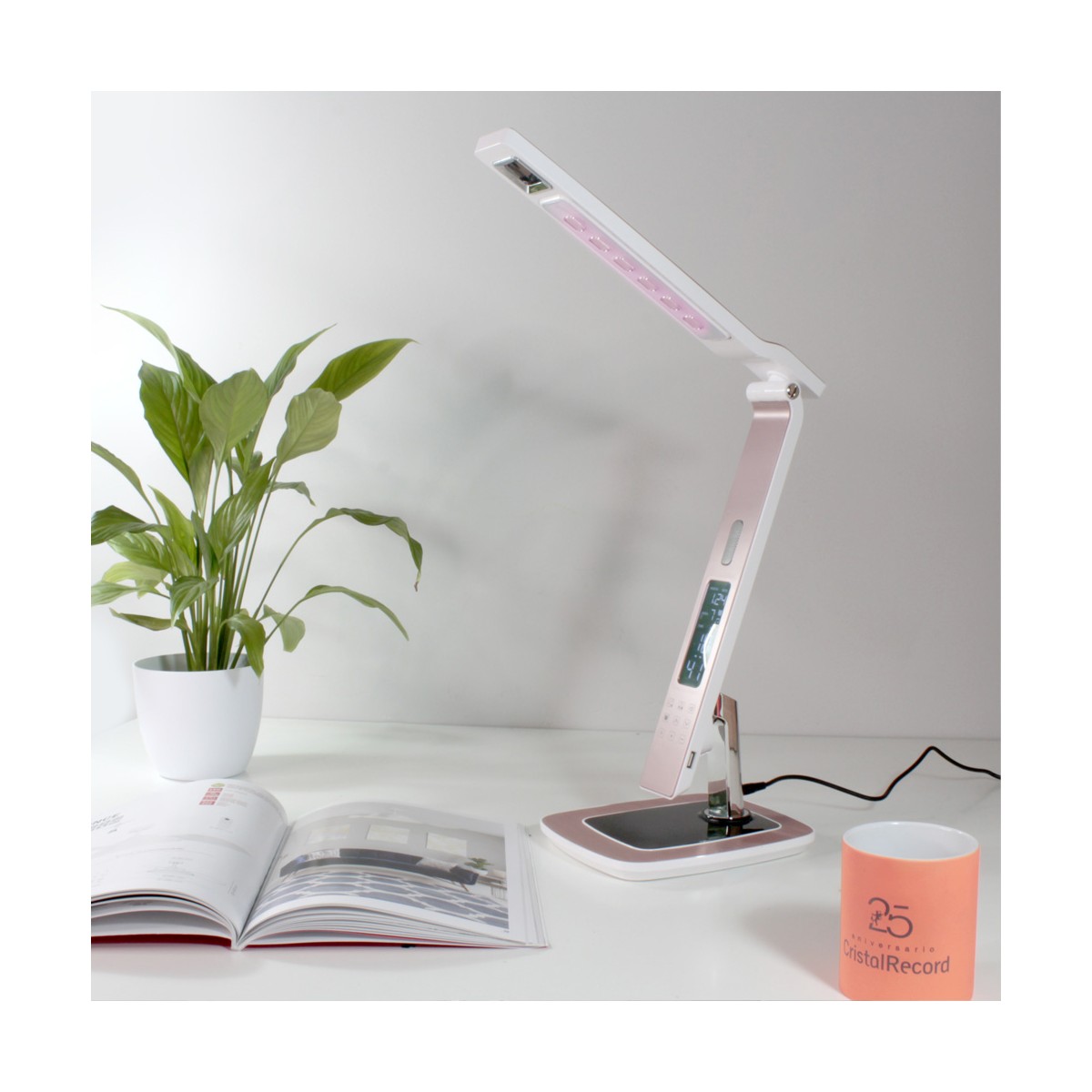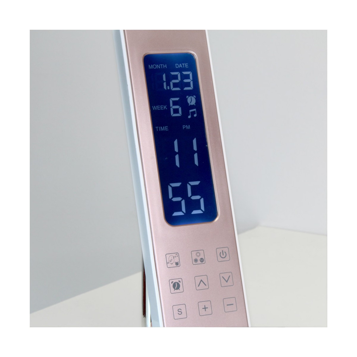 Flexo LED con alarma despertador y control táctil. Pantalla LCD digital con fecha y hora y puerto USB que permite cargar dispositivos electrónicos. Alarma despertador y prealarma (0-2-5-10-15 minutos) configurable para que las luces comiencen a encenderse de manera gradual acompañado de un sonido de pájaros. Tres tonalidades y 6 intensidades de luz para conseguir la iluminación perfecta en momento de estudio o de lectura.