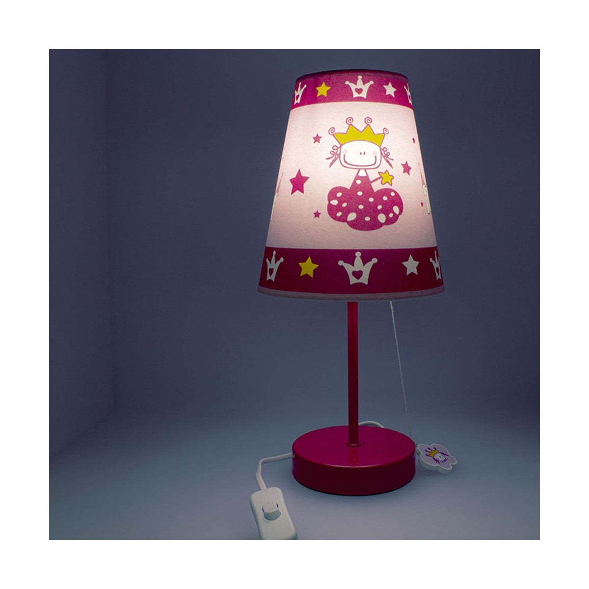 Lámpara de mesa en color rosa de estilo infantil con divertidos dibujos de princesas en la pantalla. Fácil reemplazo de la bombilla.