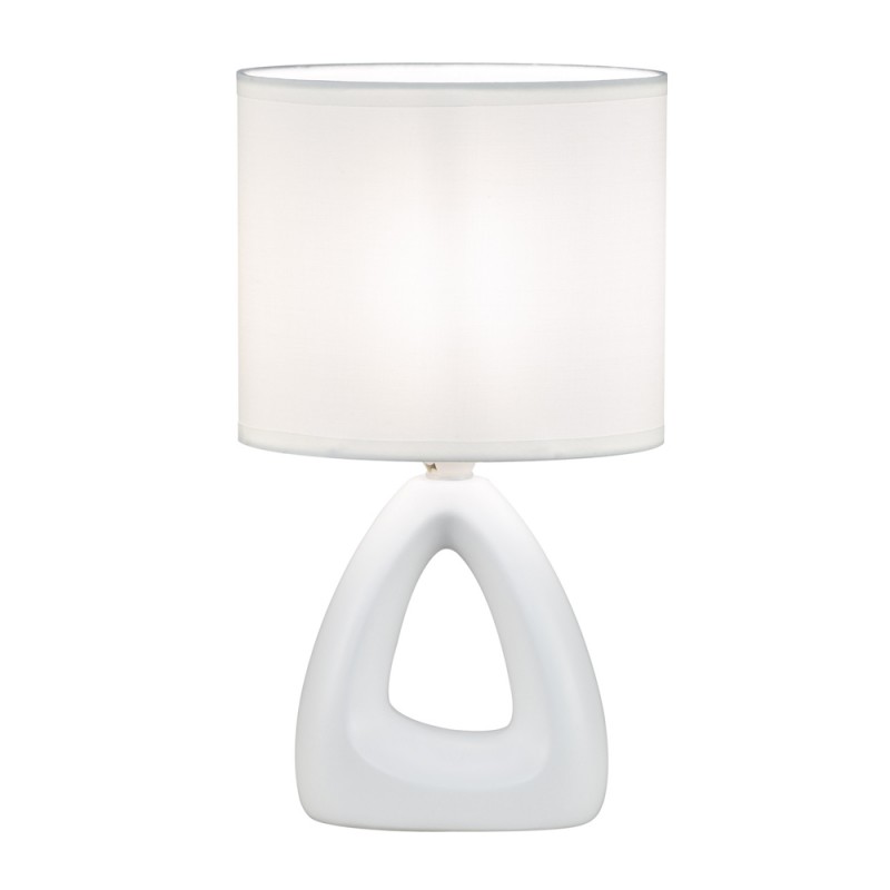 Lampara de mesa Greip de cerámica blanca. Lampara de sobremesa para colocar en mesitas de noche en habitaciones o en mesas auxiliares en salones. Base de cerámica blanca y pantalla de tela blanca. Interruptor ON-OFF en en el cable. Bombilla no incluida.