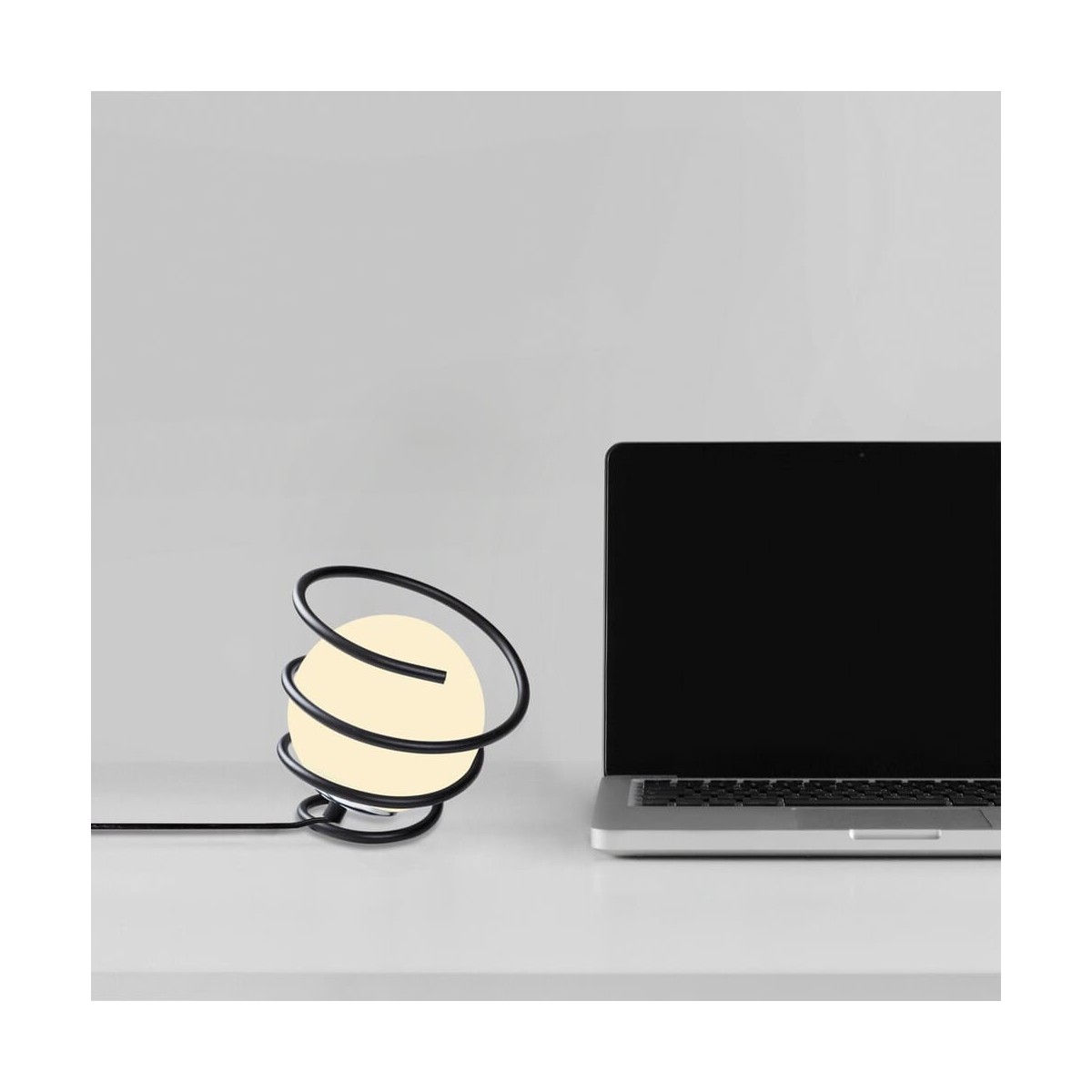 Lámpara de mesa decorativa de una luz con tulipa de cristal blanco mate y espiral metálica negra. Perfecta para mesillas de noche o salones aportando un estilo diferenciador. Apta para una bombilla con base E27.