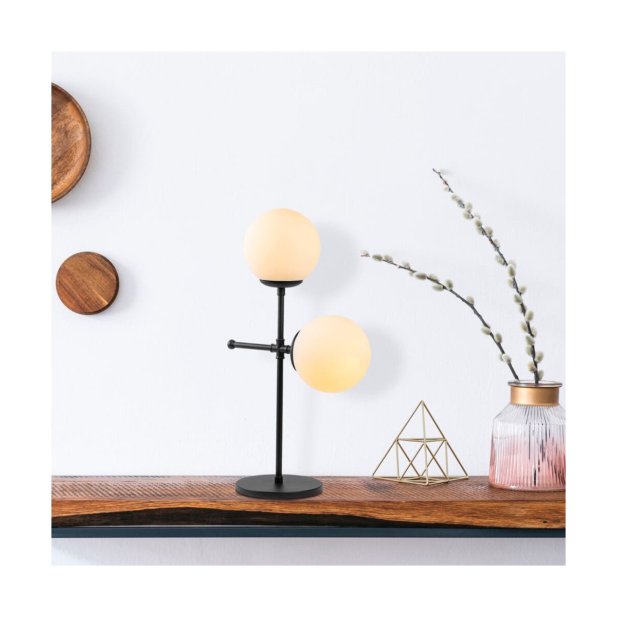 Lámpara de mesa metálica con acabado oro y dos luces con tulipa de cristal blanco mate. La base redonda de la lámpara mide 12 cm. La altura total es de 55 cm.