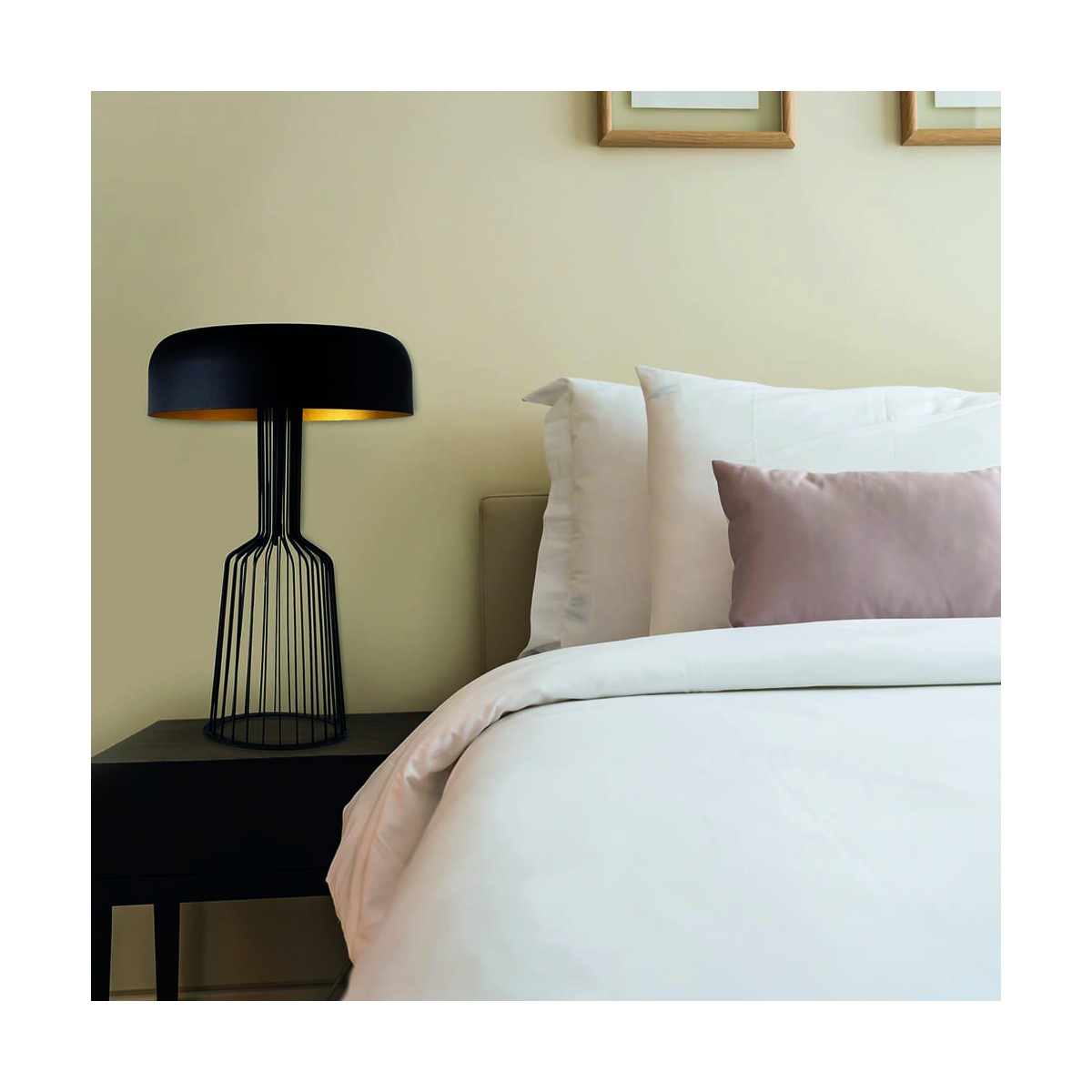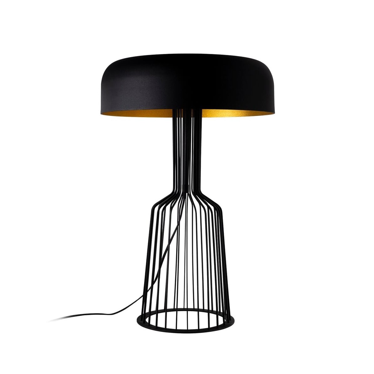 Lámpara de mesa decorativa de estilo industrial. Fabricada en metal lacado en negro, con el interior de la pantalla dorado. Funciona con una bombilla E27, no incluida. La lámpara mide un totoal de 57 cm de alto, y tiene un cable de 2 metros.
