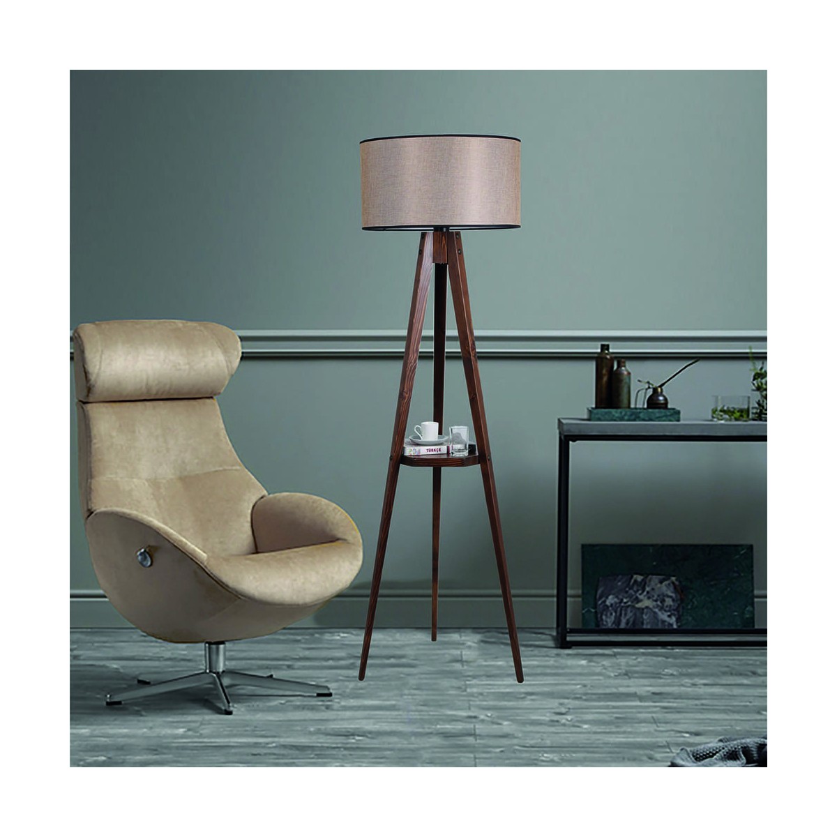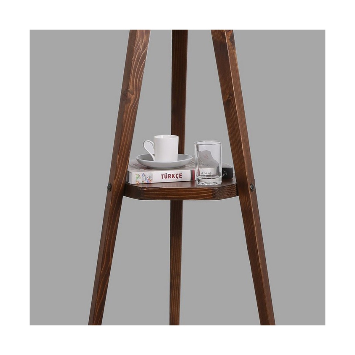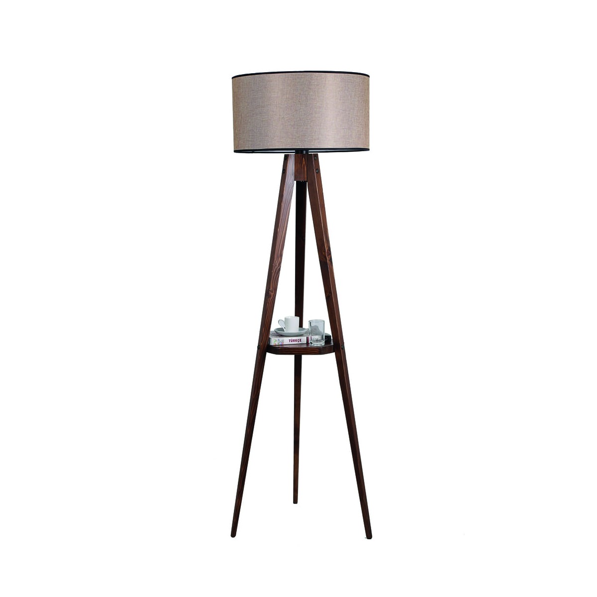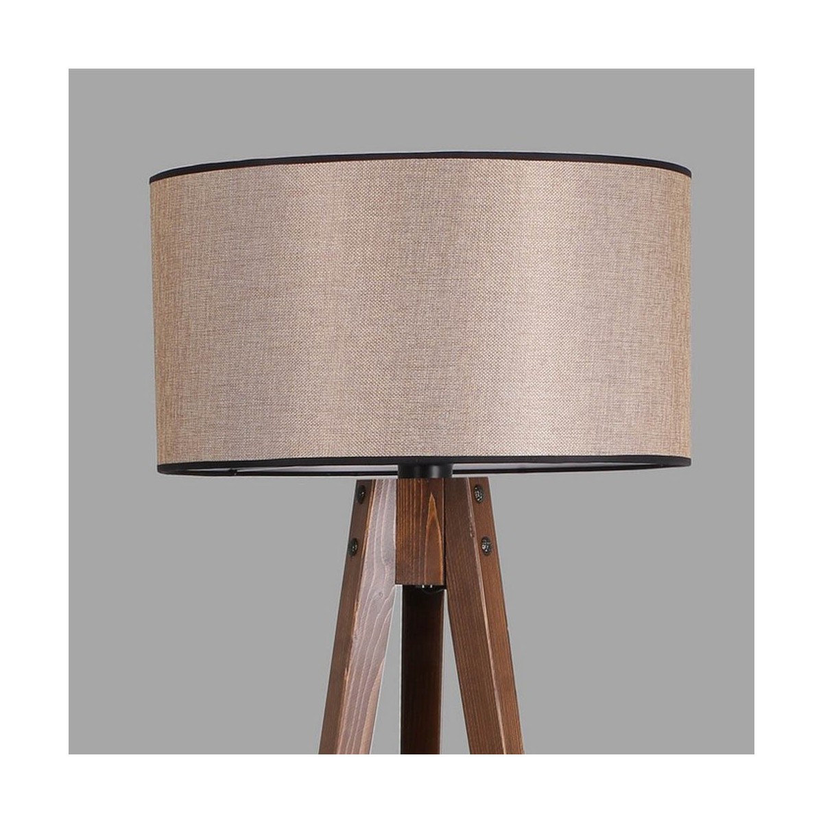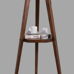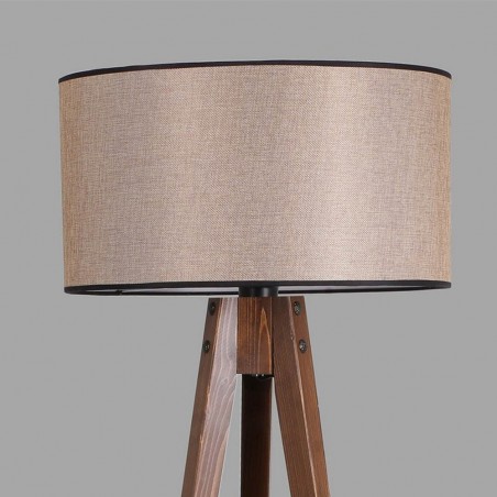 Lámpara de pie con tres patas de madera y mesita auxiliar de153cm de alto y una base total de 50cm. La pantalla de tela, disponible en varios colores, tiene un diámetro de 45cm y una altura de 24cm. La mesita auxiliar redonda de 26cm queda a una altura de 65cm del suelo. Funciona con una bombilla E27 no incluida. El botón de encendido y apagado de la lámpara se encuentra en el cable.